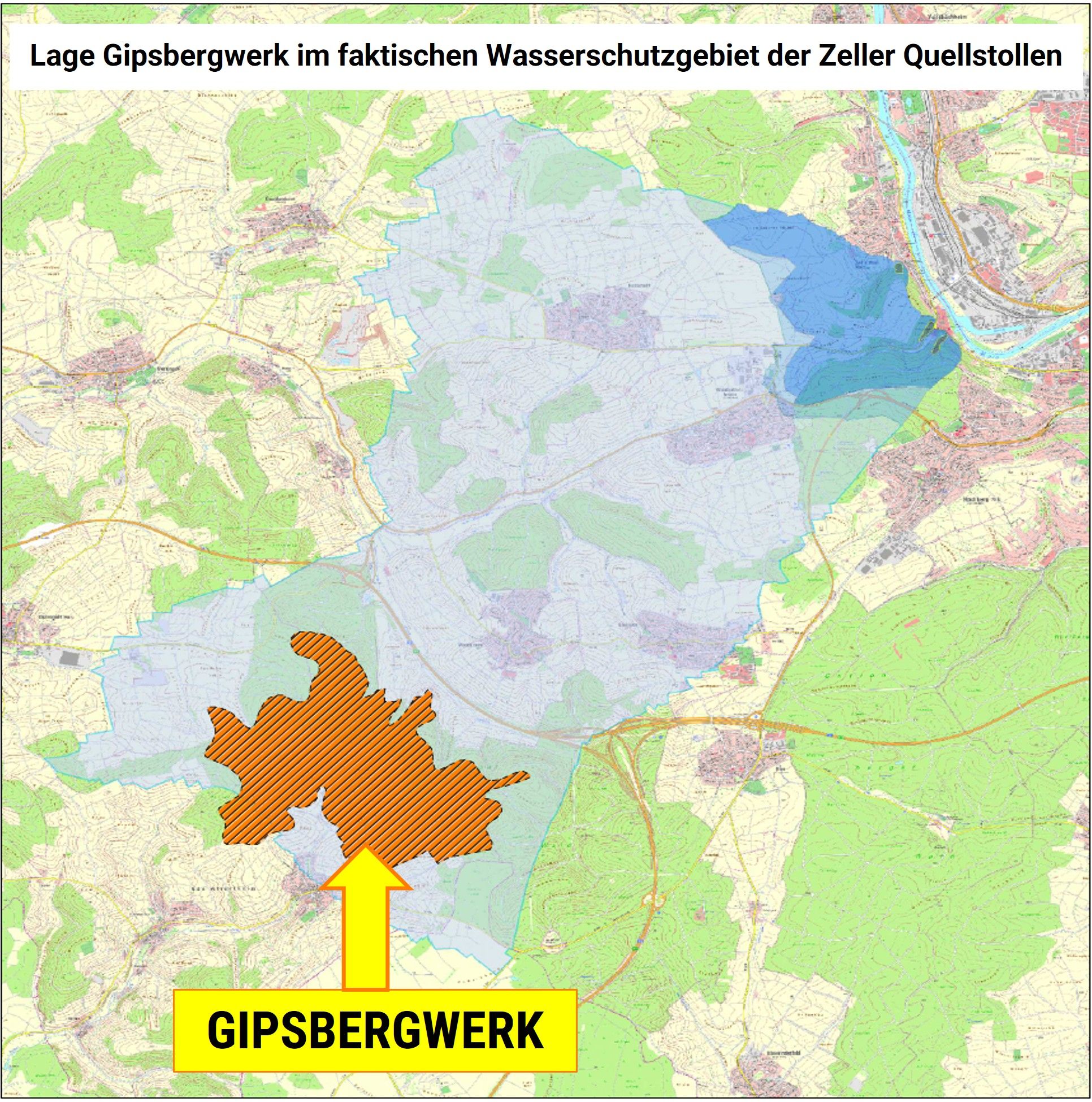 Westlich von Würzburg ist ein Gipsbergwerk im Trinkwasser-Einzugsgebiet der „Zeller Quellstollen“ geplant. Diese sind von zentraler Bedeutung für Würzburg. Um die Wasserversorgung der Stadt für die Zukunft sicherzustellen, soll deshalb das vorhandene, zu kleine Wasserschutzgebiet auf den gesamten Einzugsbereich der “Zeller Quellstollen” ausgedehnt werden. Doch genau in der Erweiterungszone plant das Unternehmen Knauf ein Bergwerk einzurichten. Auf einer Fläche von sieben Quadratkilometern will Knauf 60 Jahre lang anfangs jährlich 300.000 Kubikmeter, auf dem Höhepunkt bis zu eine Million Kubikmeter Naturgips fördern.