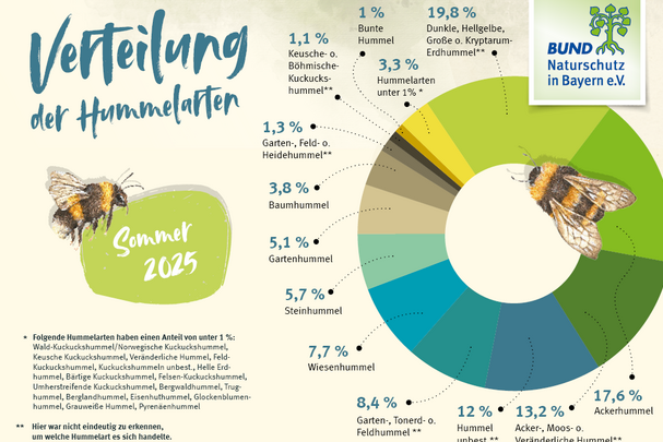 Gemeinsam mit Ihnen wollen wir mehr über Bayerns Hummeln herausfinden. Denn umso besser können wir sie und ihre Lebensräume schützen. Deshalb gibt es die Hummel-Challenges, bei denen Sie uns melden, wann und wo Sie eine bestimmte Hummelart gesehen haben. Die nächste Hummel-Challenge findet im März und April 2026 statt.