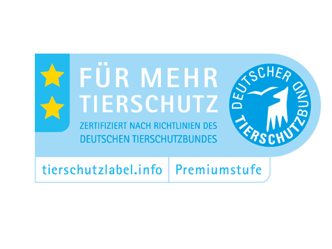 Das Label “Für mehr Tierschutz” wird vom Deutschen Tierschutzbund vergeben. Es gibt nur zwei Kategorien: Einstieg oder Premium, ein oder zwei Sterne. Beide Kategorien berücksichtigen Umweltaspekte, vorrangig geht es aber um den Tierschutz.