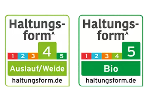 - Bis 2025 hatte das “Haltungsform”-Label nur vier Stufen. Die Haltungsform 4, "Premium" genannt, beinhaltete konventionelle und Bio-Produkte. Wie beim staatlichen Label wurde diese Stufe dann aufgeteilt in die neue Haltungsform "4 Auslauf/Weide" für konventionell erzeugte Produkte und die neue Stufe "5 Bio" für die ökologisch erzeugten Produkte.
