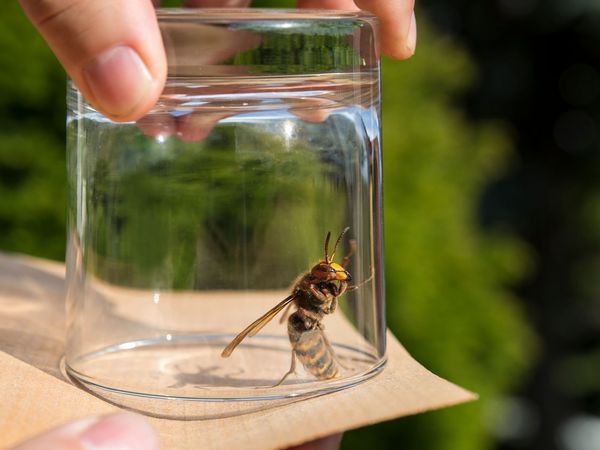 - Bei Bedarf einfangen: Hornissen lassen sich mit einem Trinkglas und einem darunter geschobenem Pappdeckel leicht fangen und nach draußen befördern. Gehen Sie dabei ruhig und bedacht vor.