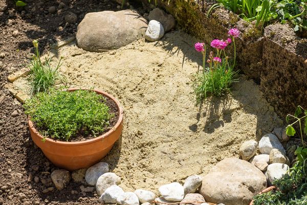 - Als Begrenzung kann man das Sandarium mit Steinen einfassen.
