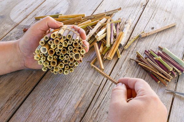 - Sie können auch Bündel aus markhaltigen Pflanzenstängeln wie Holunder, Königskerze, Himbeere, Distel oder Rose verwenden. Diese sollten senkrecht aufgestellt werden.