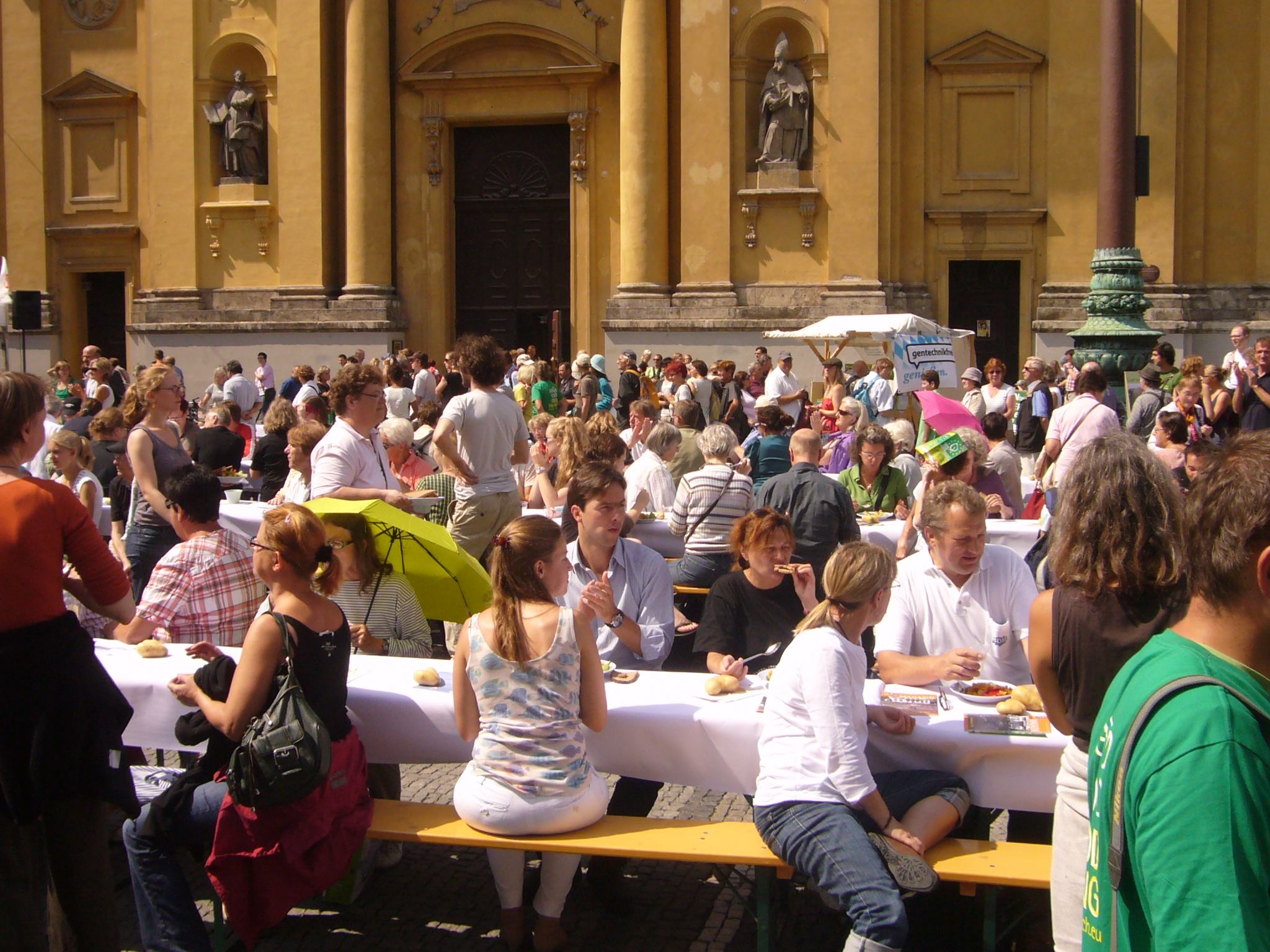 1500 Verbraucherinnen und Verbraucher haben heute auf dem Münchner Odeonsplatz am Aktionstag „Teller statt Tonne“ gegen Lebensmittelverschwendung teilgenommen und ein aus nicht vermarktbaren Gemüse zubereitetes Essen verzehrt. Die Veranstaltung war der erfolgreiche Auftakt zum Good Food March, einer dreiwöchigen Rad- und Treckertour nach Brüssel für eine zukunftsfähige Lebensmittelwirtschaft und eine bäuerliche, sozial- und umweltgerechte Landwirtschaftspolitik. Slow Food Deutschland hatte gemeinsam mit dem Bund Naturschutz in Bayern, dem Evangelischen Entwicklungsdienst, der Arbeitsgemeinschaft bäuerliche Landwirtschaft, Mission EineWelt und der Kampagne Meine Landwirtschaft zu dieser Aktion aufgerufen.