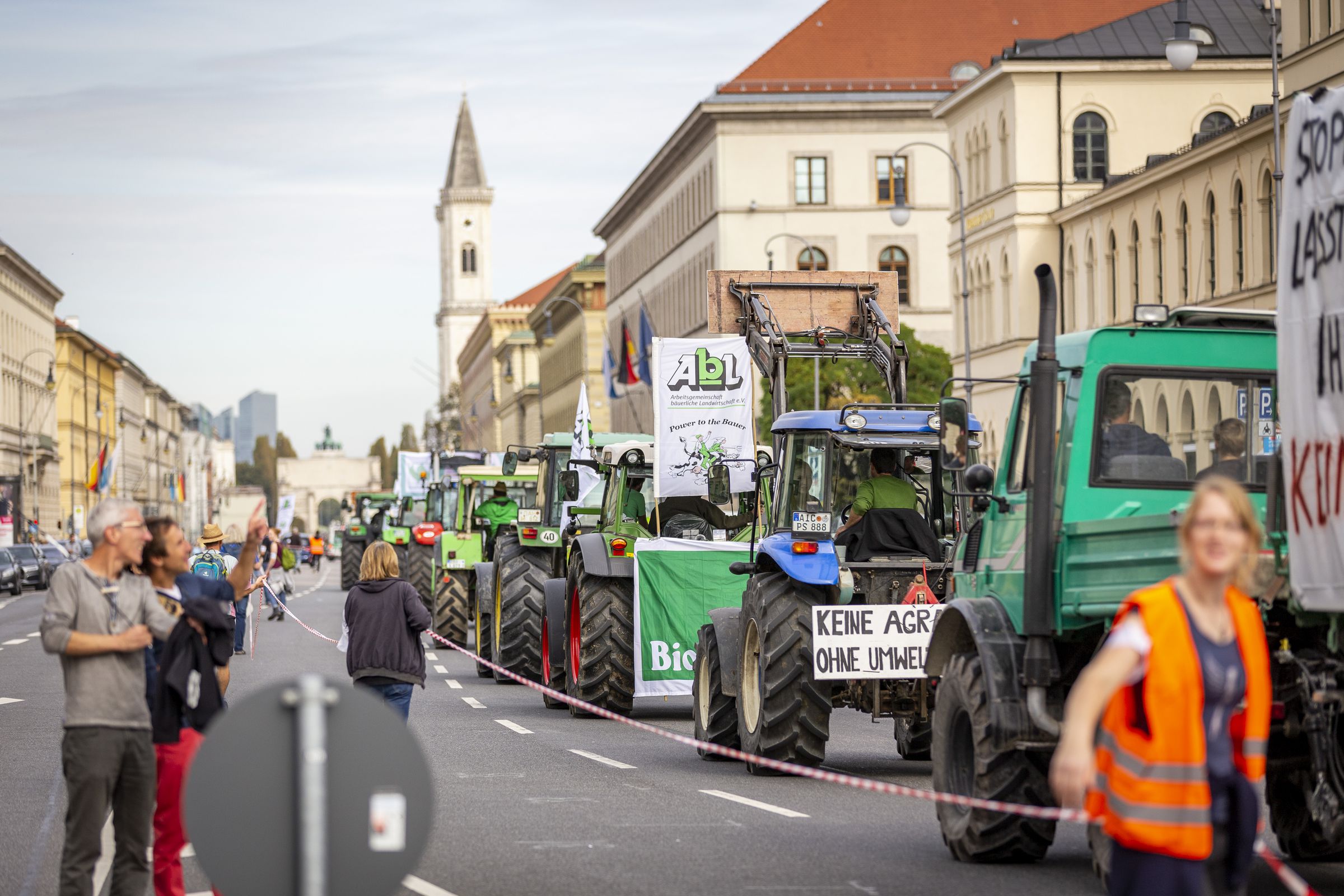 Von über 20 Traktoren und Motivwägen begleitet – unter anderem einer riesigen Betonwelle, einem Megastall-Laster und einem Pestizidsarg – bewegte sich der Demonstrationszug mit Transparenten, Bannern und Fahnen vom Königsplatz über die Brienner Straße zum Odeonsplatz, von dort über die Ludwigstraße in die Theresienstraße und über die Arcisstraße zurück zum Königsplatz.