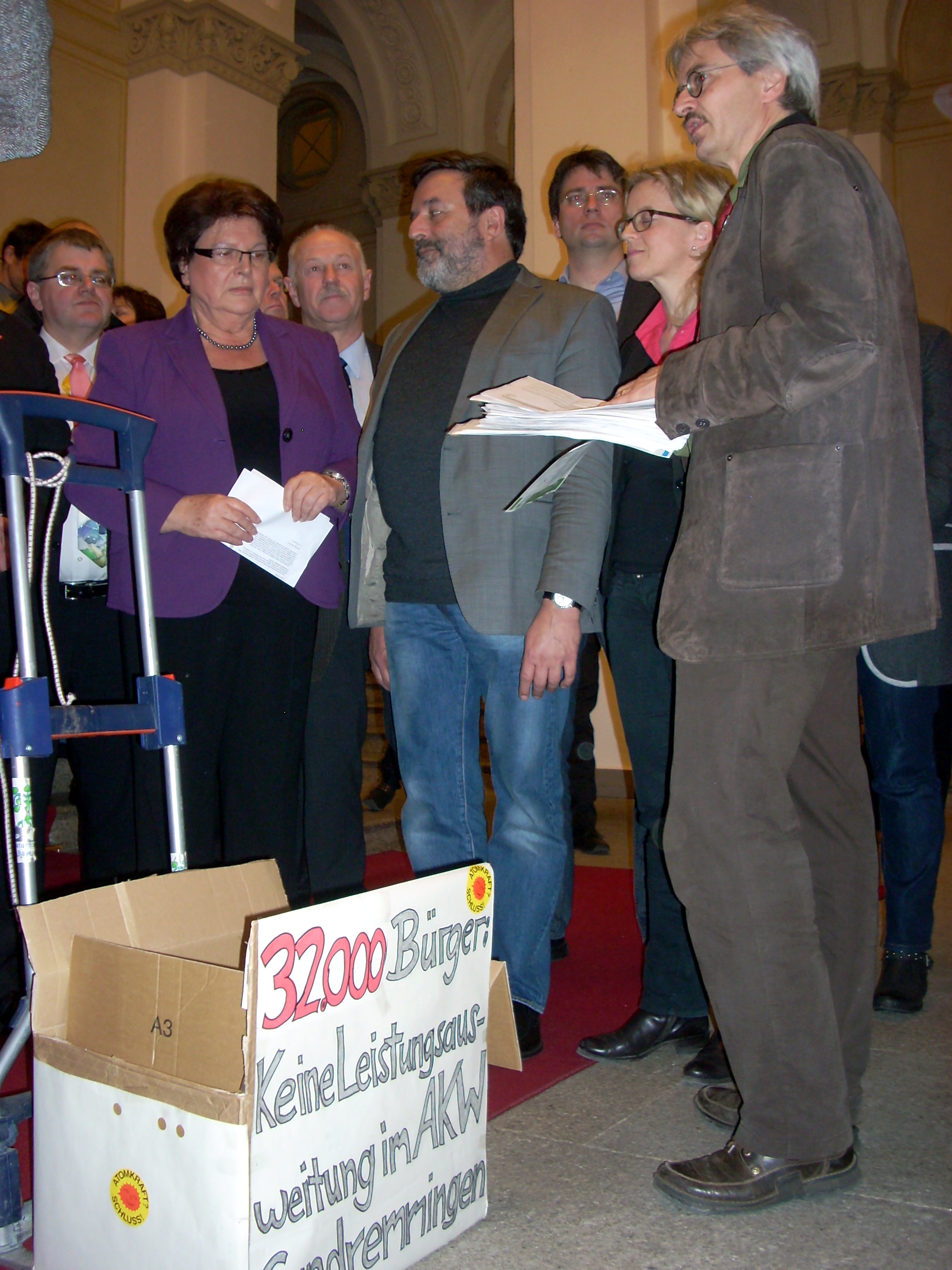 Nachdem bereits im Frühsommer ca. 7000 bayerische Bürger in einer Petition den Landtag gebeten haben, die von RWE und E.ON beantragte Ausweitung der Atomstromproduktion im bayerischen Atomkraftwerk Gundremmingen abzulehnen, haben über den Sommer noch mal zusätzlich 25.000 Bürger die Petition unterschrieben. Der Umweltausschuss des Landtages hatte die Petition in seiner Sitzung vom 11.7.2013 bereits kurz beraten und auf einen Termin nach der Wahl vertagt. Jetzt erfolgte die Übergabe der zusätzlichen 25.000 Unterschriften.
