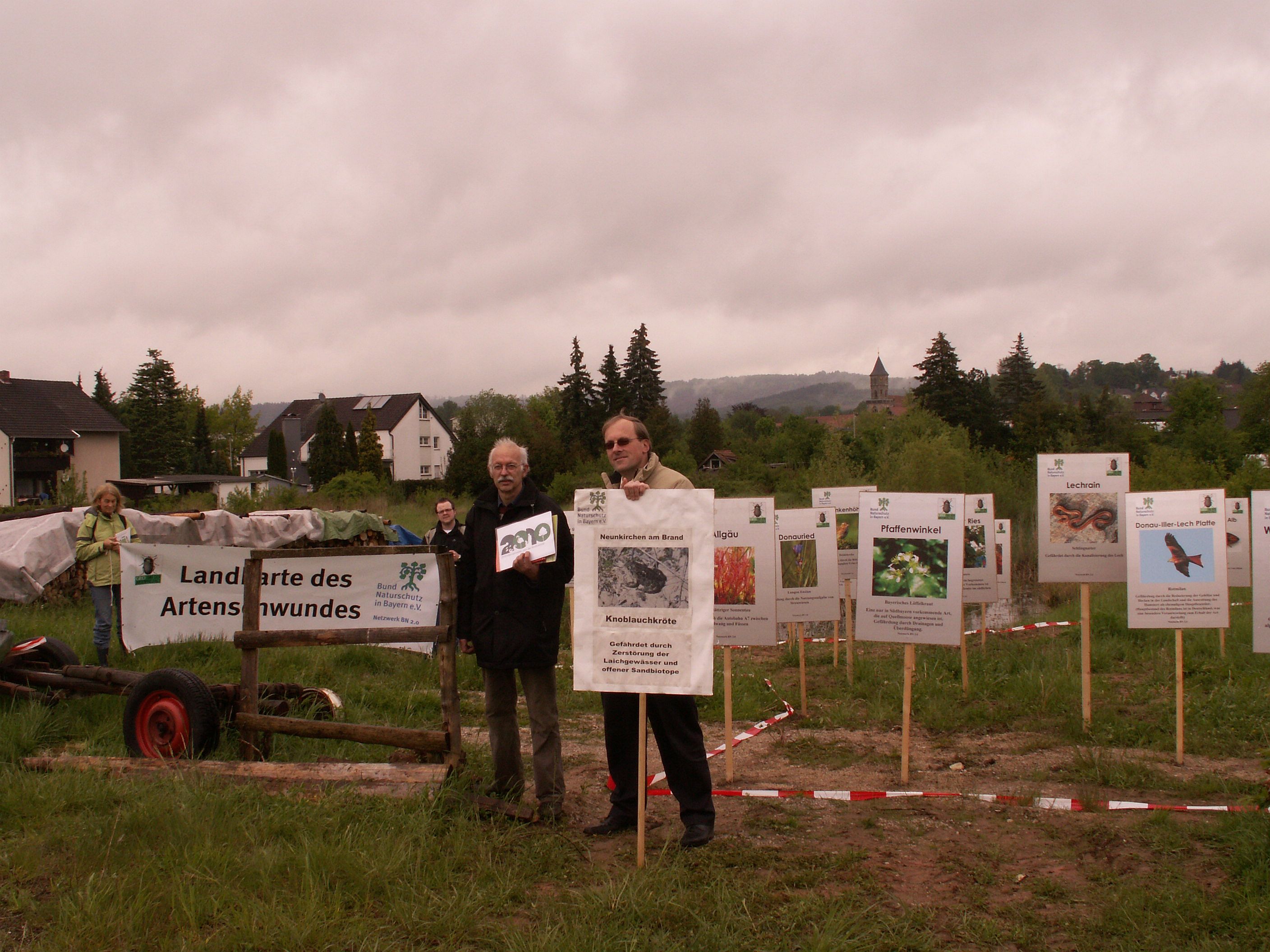 Mit einer spektakulären Aktion machten Aktive der BN-Kreisgruppe Forchheim, der Ortsgruppe Neunkirchen am Brand auf den anhaltenden Arten- und Lebensraumverlust in Bayern aufmerksam. Dazu stellten sie über 30 große Hinweisschilder gefährdeter Pflanzen- und Tierarten in Form einer Landkarte Bayerns auf.