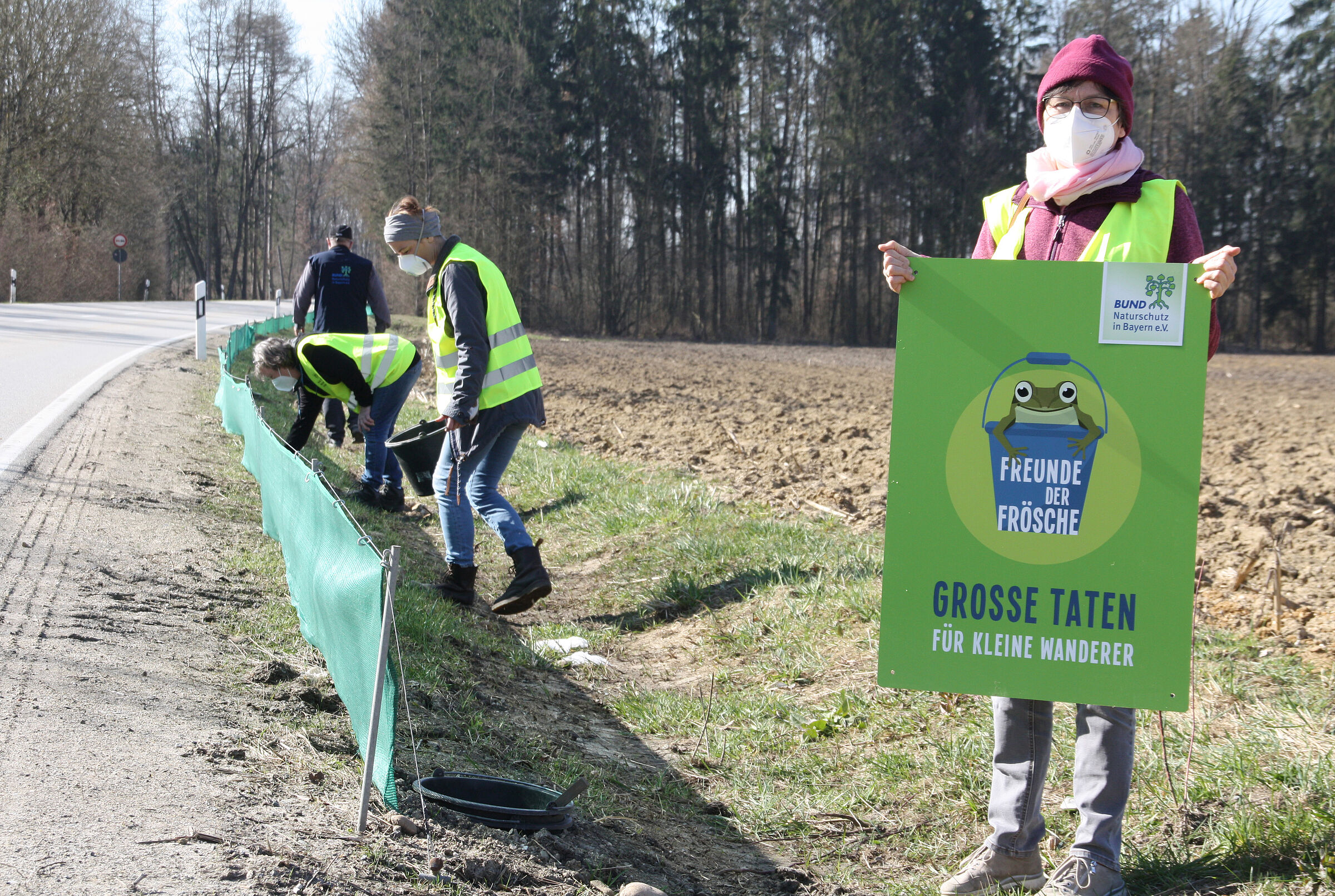 * Achten Sie an den Stellen, an denen Amphibienzäune errichtet sind, auf die Helfer, die am Straßenrand Tiere einsammeln.