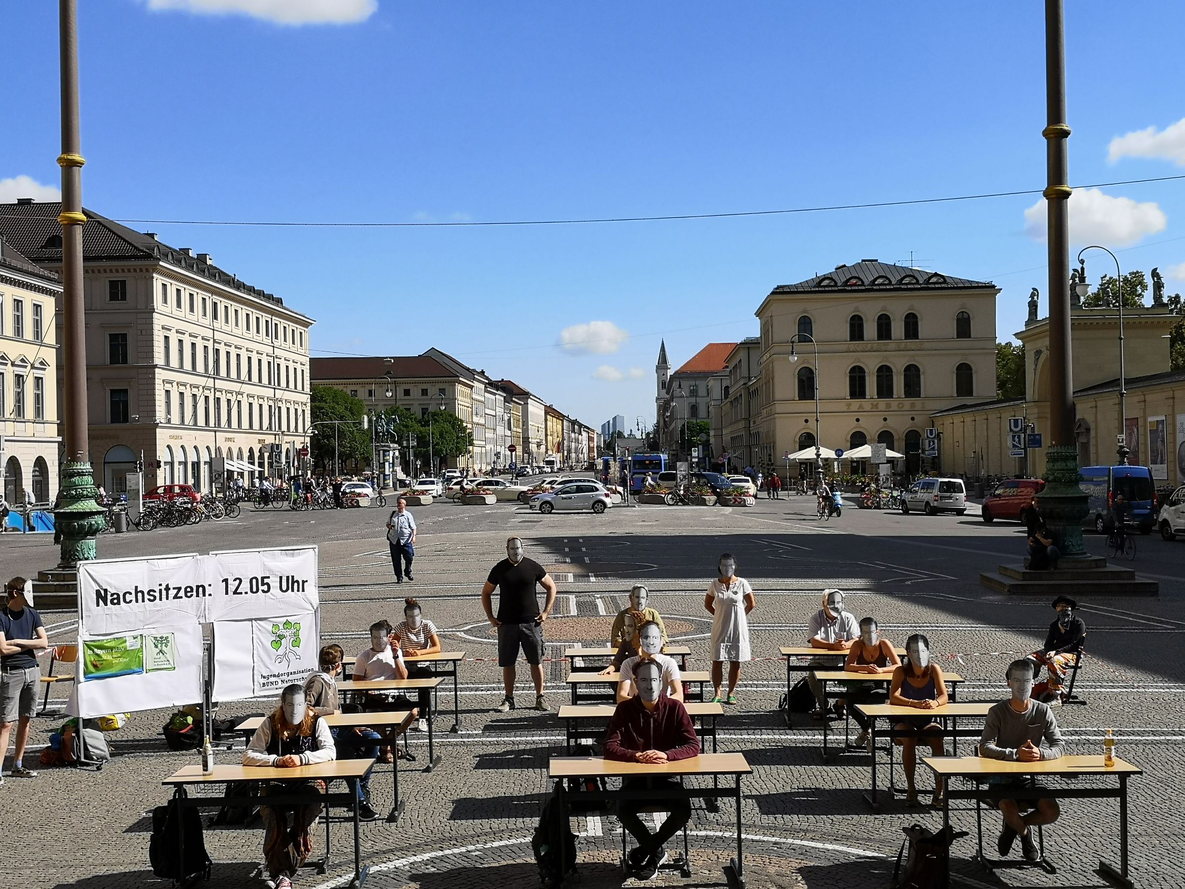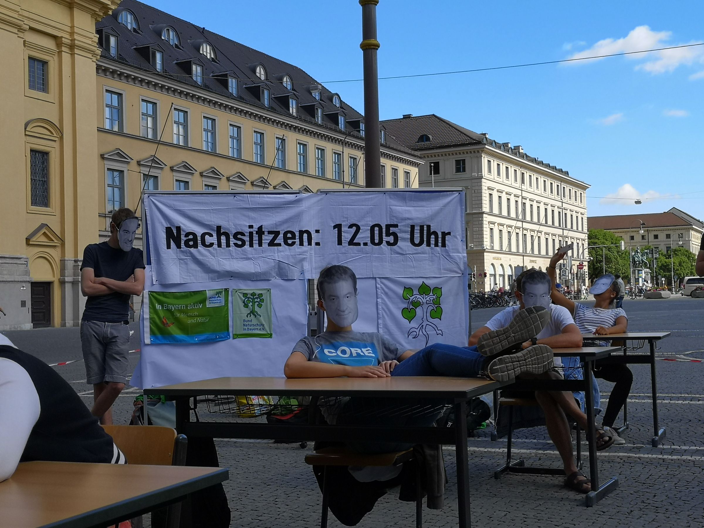 Kurz vor der parlamentarischen Sommerpause im Landtag bauten BN, FFF und JBN ein Klassenzimmer auf dem Odeonsplatz auf. Die Schüler*innen an den Bänken trugen Markus Söder – und Hubert Aiwanger-Masken. Die Jugendorganisationen überreichen diesen beiden Politikern ihre Zeugnisse mit der Note 6 im Klimaschutz und rufen CSU und Freie Wähler dazu auf, über die Sommerpause nachzusitzen und beim Klimaschutzgesetz und dessen Begleitmaßnahmen nachzubessern.
