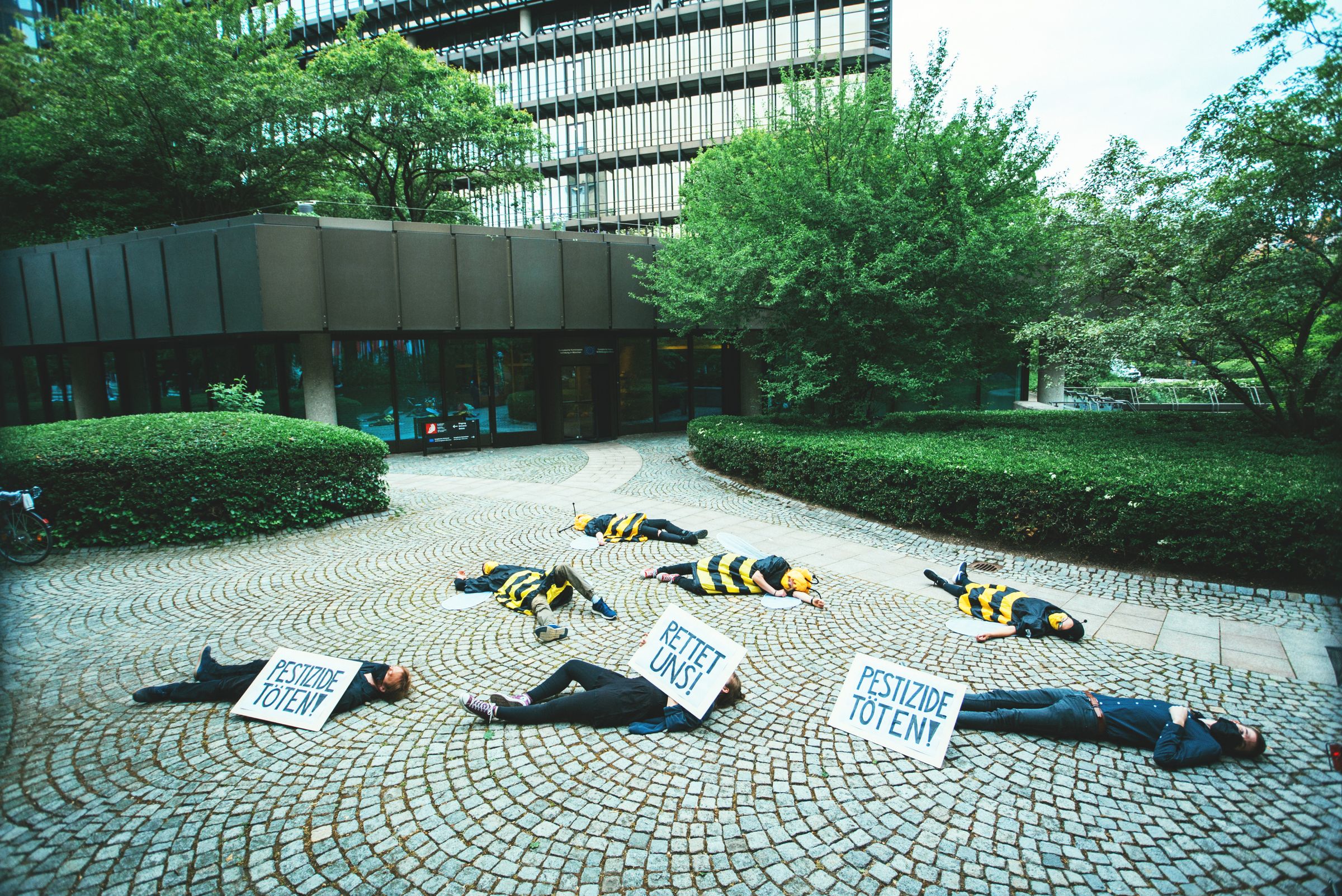 Um die gefährliche Wirkung von Pestiziden auf Bienen zu verdeutlichten, inszenieren die Umweltschützer*innen in Bienenkostümen vor der EU-Vertretung am Bob-von-Benthem-Platz in München ein „Die-in“ und präsentierten Schilder mit den Botschaften „Rettet uns!“ und „Pestizide töten!“. Während die meisten Pestizide bei Bienen nicht sofort zum direkten Tod führen, verringern sie doch die Überlebens- und Entwicklungschancen der Tiere massiv: Beispielsweise schädigt Glyphosat das Immunsystem von Bienen, während Sulfoxaflor die Fruchtbarkeit von Erdhummeln beeinträchtigt und Flupyradifuron die Lernfähigkeit von Jungbienen beeinträchtigt.