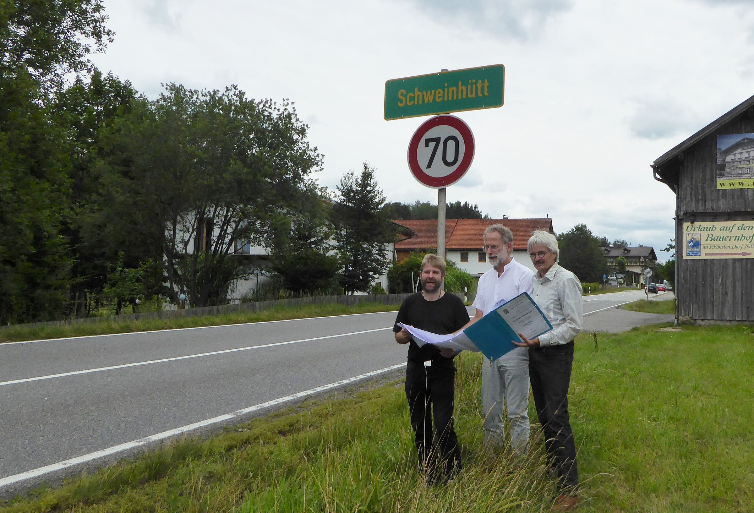 Anlage: Foto Jaedicke: Mergner informiert sich zum B11-Ausbau Schweinhütt. Von links: Thomas Kaehler, stv. Vorsitzender der BN-Kreisgruppe Regen und Stadtrat in Regen, erläutert BN-Verkehrsexperten Heinrich Inkoferer und BN-Landesvorsitzenden Richard Mergner die Ausbaupläne zur Ortsumfahrung Schweinhütt. Hier ist eine weiträumige Umfahrung mit massiver Landschaftszerstörung geplant. Lärmschutzmaßnahmen für die wenigen Betroffenen wurden nicht geprüft, der eigentliche Ortskern liegt abseits der jetzigen Trasse.