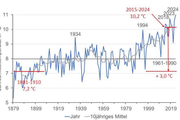 1.1.25. Mit 11,1 Grad Durchschnittstemperatur war das Jahr 2024 das wärmste jemals in…