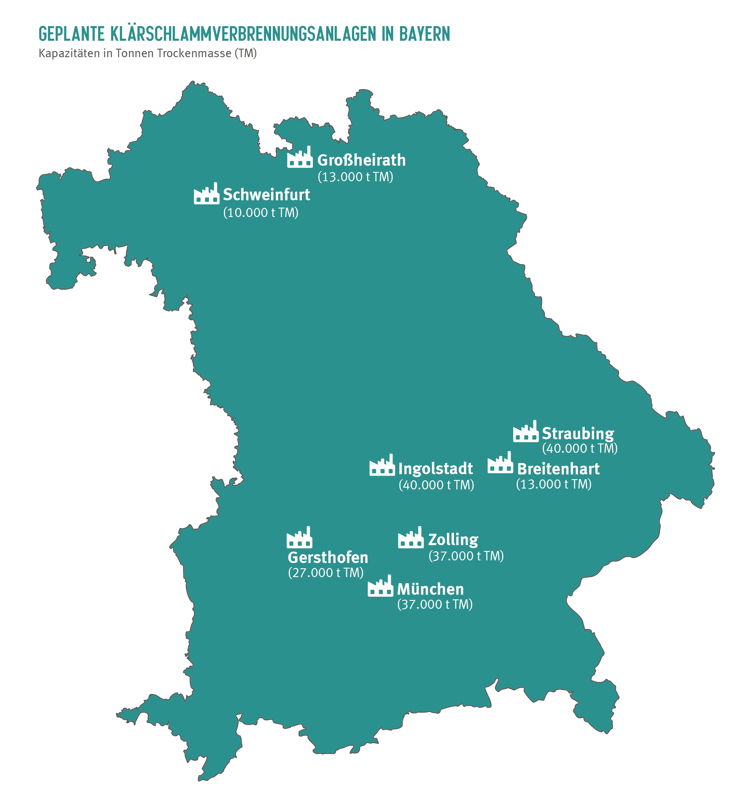 Dem BN sind derzeit Planungen für Klärschlammverbrennungsanlagen an folgenden Standorten bekannt: Gersthofen (Lkr. Augsburg), Straubing, Breitenhart (Lkr. Straubing-Bogen), Schweinfurt, München, Ingolstadt, Großheirath (Lkr. Coburg), Zolling (Lkr. Freising).