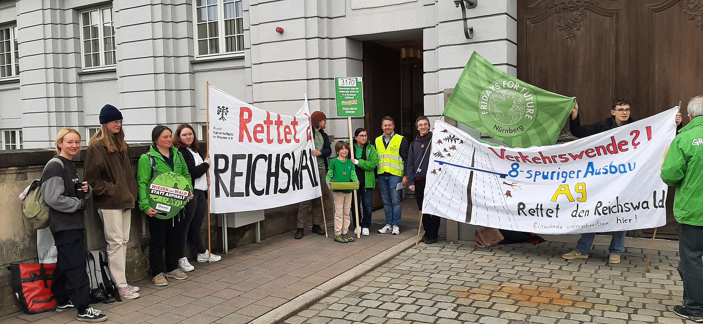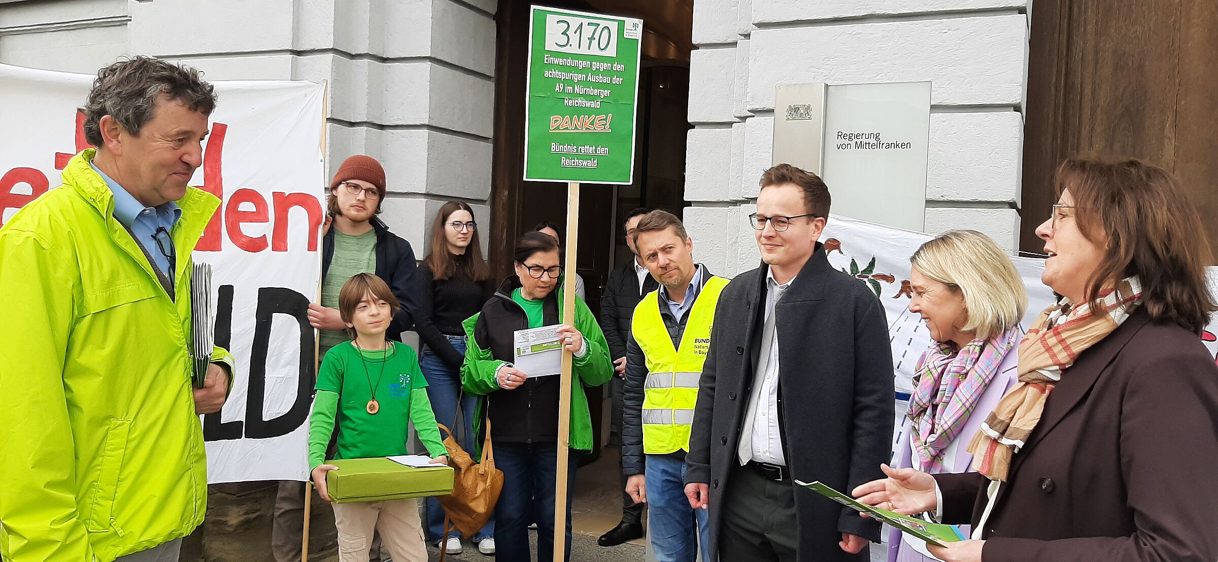 Der BUND Naturschutz in Bayern und das Bündnis „Rettet den Reichswald“ haben Einwendungen gegen den geplanten achtspurigen Ausbau Autobahn A9 im Nürnberger Reichswald gesammelt und am Mittwoch, den 27. März an die Regierung von Mittelfranken übergeben. Die Vertreter*innen aus dem BN, von Greenpeace, dem Verein Reichswald bleibt e.V. und Fridays for future wurden vor dem Ansbacher Schloss von Frau Regierungsvizepräsidentin Birgit Riesner, Frau Regierungsdirektorin Karin Christ (Pressesprecherin) und Herr Stellv. Sachgebietsleiter Michael Fertl empfangen. Bis zum 2. April 2024 läuft noch die Öffentlichkeitsbeteiligung im Planfeststellungsverfahren. Gegenstand des Verfahrens ist der Antrag der Autobahn GmbH für den Ausbau zwischen den Autobahnkreuzen Nürnberg und Nürnberg-Ost.