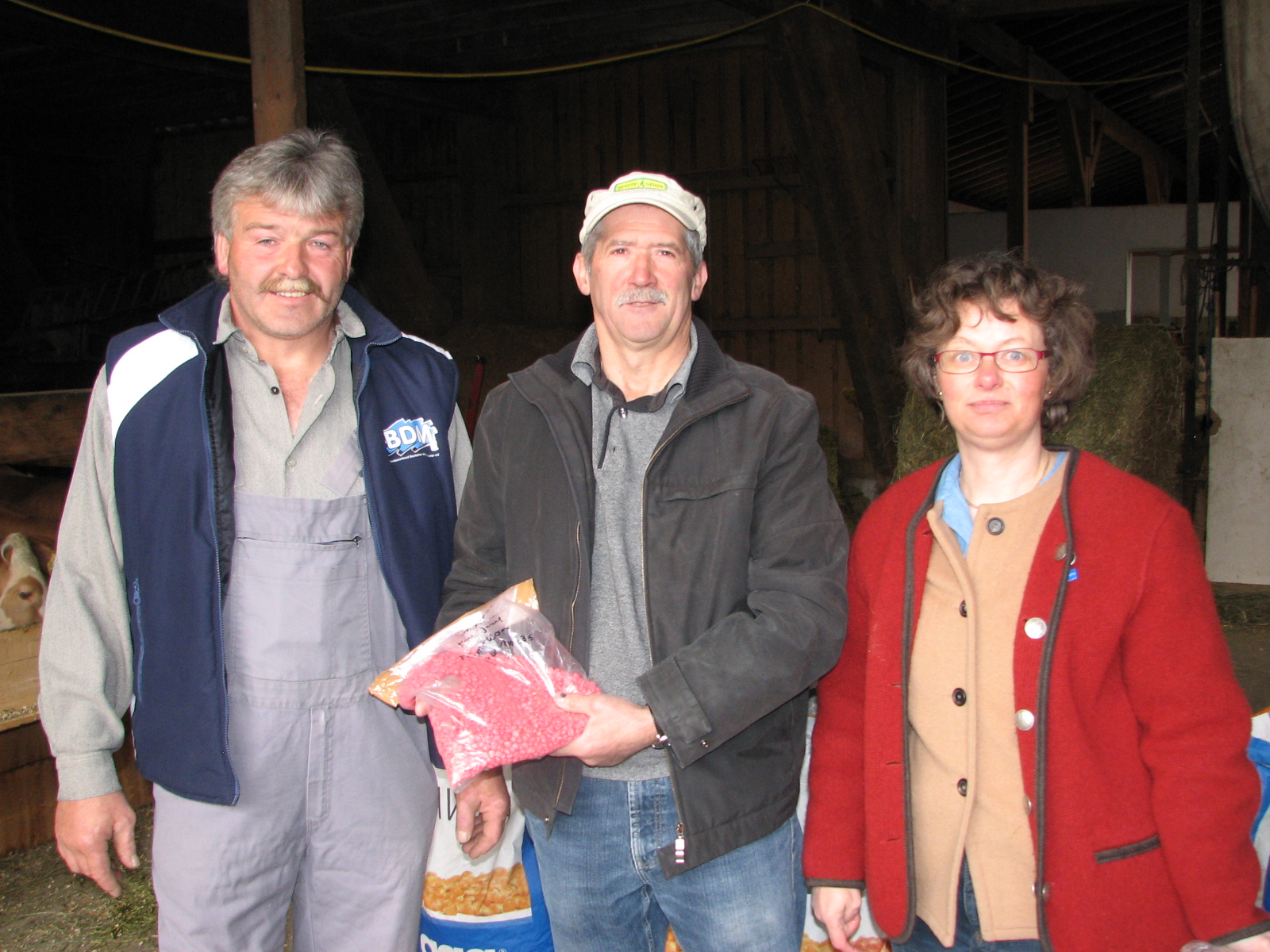 (Bildunterschrift: v. links: Landwirt Josef Frey, Fritz Bichler und Christine Räder ziehen Proben vom Maissaatgut)