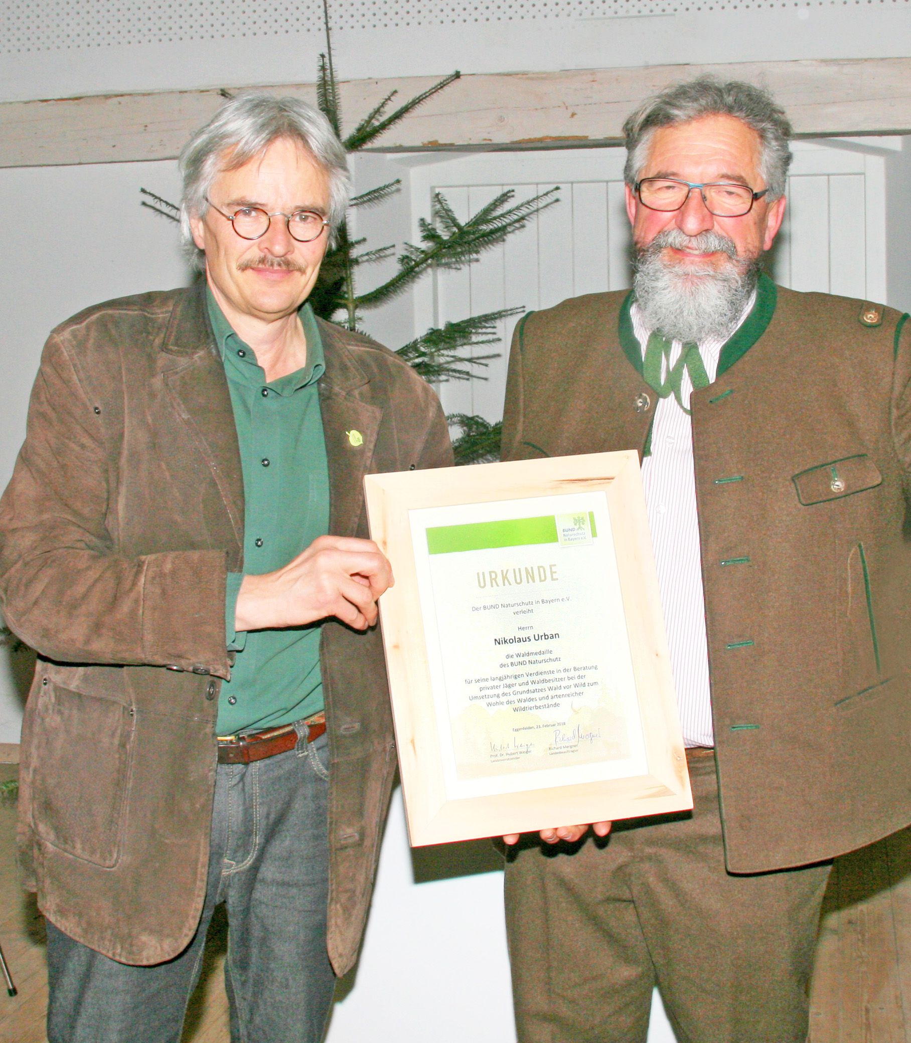"Wir ehren Klaus Urban, weil er in vorbildlicher Weise Waldbesitzer und Jäger beim Umdenken in der Wald-Wild-Frage beraten und Lösungswege aufgezeigt hat", so Richard Mergner, Landesbeauftragter des BN. "Klaus Urban trägt somit wesentlich dazu bei, dass es in Bayern immer mehr positive Beispiele in Wäldern gibt, in denen die angesichts des Klimawandels notwendigen Baumarten wie die Weißtanne oder die Eiche auch nachwachsen können, ohne dass sie verbissen werden."