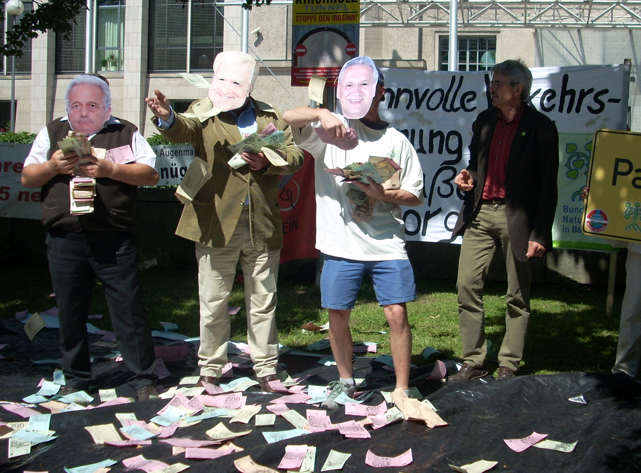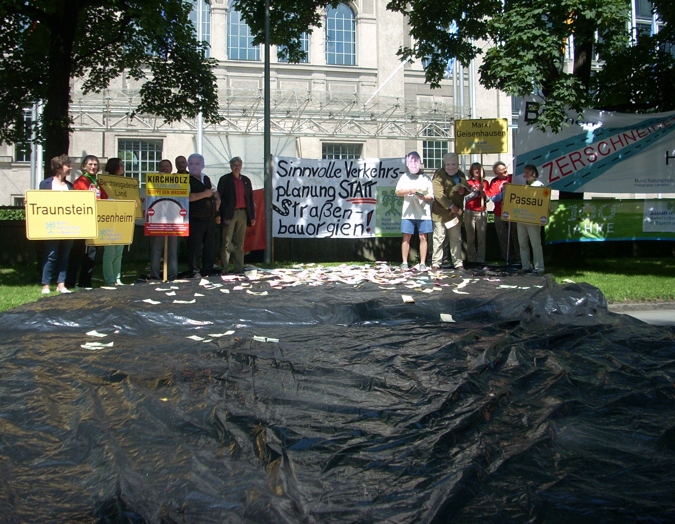 Die Forderung, dass es bei der Bundesverkehrswegeplanung kein „weiter so“ geben darf, wie es die bayerische Staatsregierung offensichtlich vor hat, brachte der BN am 2. Juli bei einer Aktion vor der Staatskanzlei zum Ausdruck. Angeprangert wurden beispielhaft die Geldverschwendung und die massiven Natur- und Landschaftszerstörungen durch drei besonders gravierende Straßenbauprojekte im südbayerischen Raum: Der geplante Weiterbau der „Autobahn“ B 15 neu von der A 92 bei Landshut bis zur A 8 bei Rosenheim, der geplante Maximalausbau der A 8 mit sechs Fahrstreifen (6 + 2) vom Inntaldreieck bis zur Bundesgrenze und die vorgeschlagenen Abschnitte der B 388 östlich von Passau, inklusive einer Nordumgehung von Passau. Der BN Landesverband und die Vertreterinnen und Vertreter der BN Kreisgruppen aus den betroffenen Regionen forderten die Streichung dieser Projekte und keine Aufnahme in den neuen Bundesverkehrswegeplan. Nach Ansicht des BN besteht für diese Straßenbauvorhaben kein Bedarf, der die massiven und vielfältigen negativen Folgewirkungen und nicht ausgleichbaren Eingriffe rechtfertigen könnte. Im Einzelnen sind daher die seit langem bekannten Alternativen ernsthaft zu untersuchen, zu planen und zu realisieren, wie der bestandsorientierte Ausbau der A8 mit Standspuren oder einzelne Ortsumfahrungen an der bestehenden B 15. Eine so genannte B 388 neu im Passauer Raum ist dagegen völlig überflüssig und ersatzlos zu streichen.