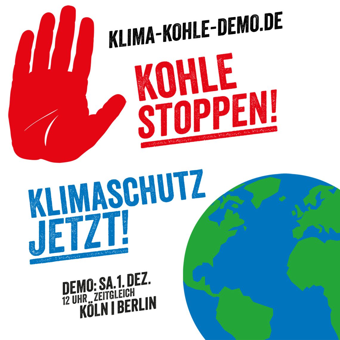 Unter dem Motto "Kohle stoppen - Klimaschutz jetzt!" finden am kommenden Samstag, den 01. Dezember 2018, in Berlin und Köln zeitgleich zwei Demonstrationen statt. Aufgerufen dazu hat ein breites Bündnis aus Umwelt- und zivilgesellschaftlichen Organisationen. Die Organisatoren erwarten für die Doppel-Demo viele Tausend Menschen, die für den konsequenten Kohleausstieg und mehr Klimaschutz auf die Straße gehen. Los geht es in Berlin am Kanzleramt und in Köln an der Deutzer Werft, jeweils um 12 Uhr. Auch aus Bayern fährt eine Vielzahl an Bussen nach Berlin.