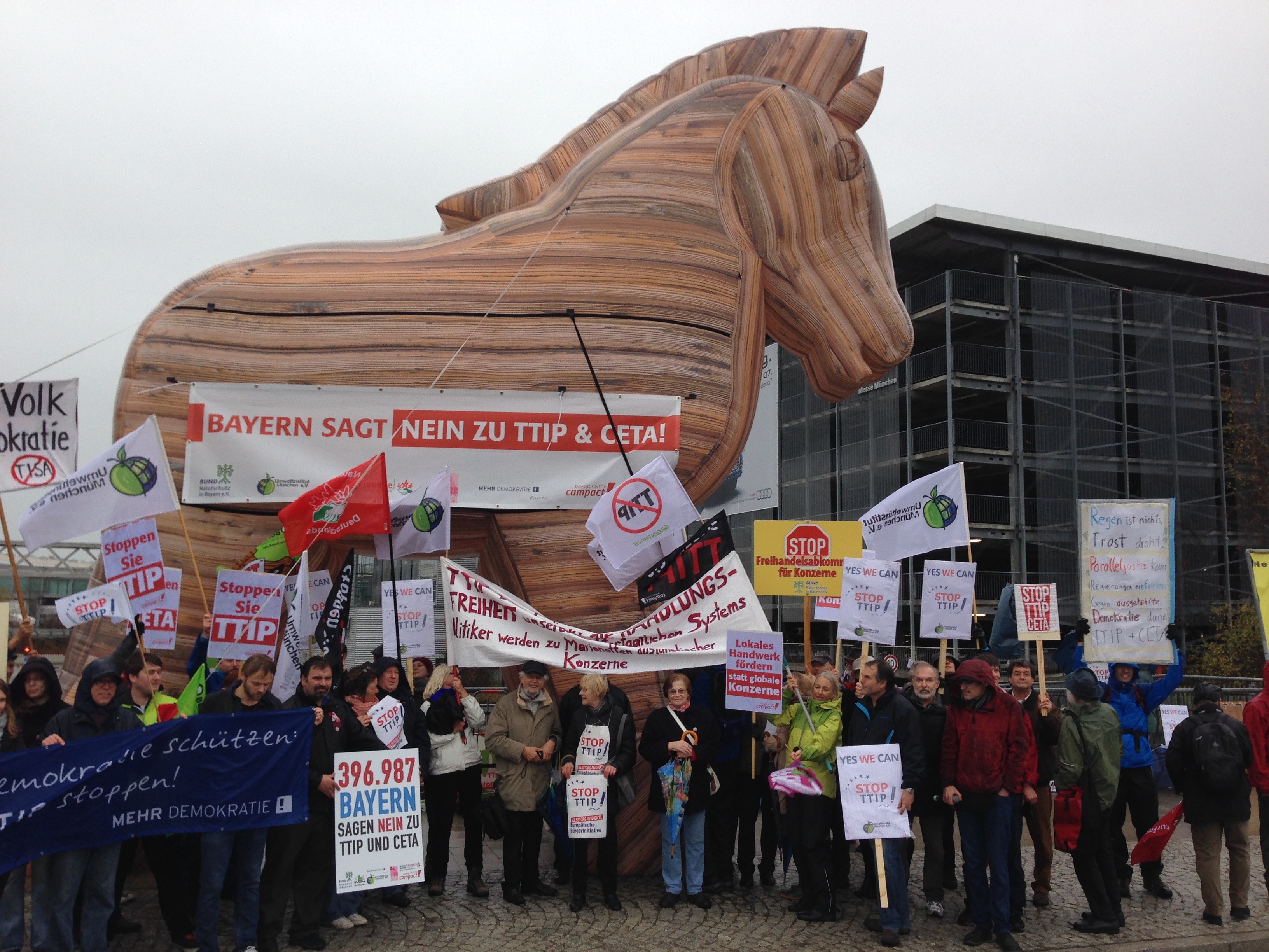 Zu der Aktion, bei der vor der Münchner Messe ein acht Meter hohes Trojanisches Pferd aufgestellt wurde, hatten sieben Bürgerorganisationen aufgerufen: Arbeitsgemeinschaft Bäuerliche Landwirtschaft (AbL), BUND Naturschutz in Bayern, Campact, Katholische Arbeitnehmer-Bewegung (KAB), Mehr Demokratie, Naturfreunde Bayern und Umweltinstitut München.