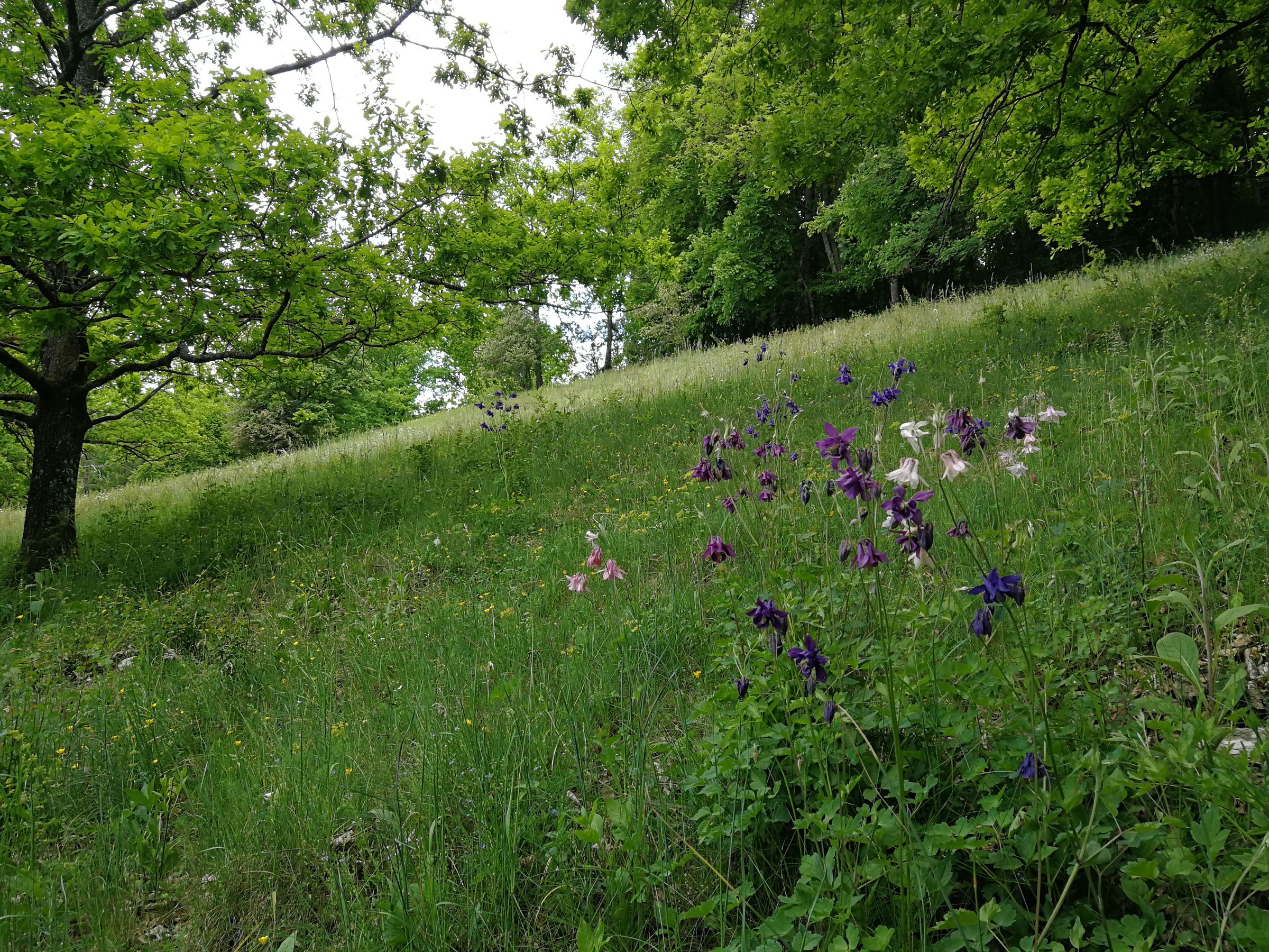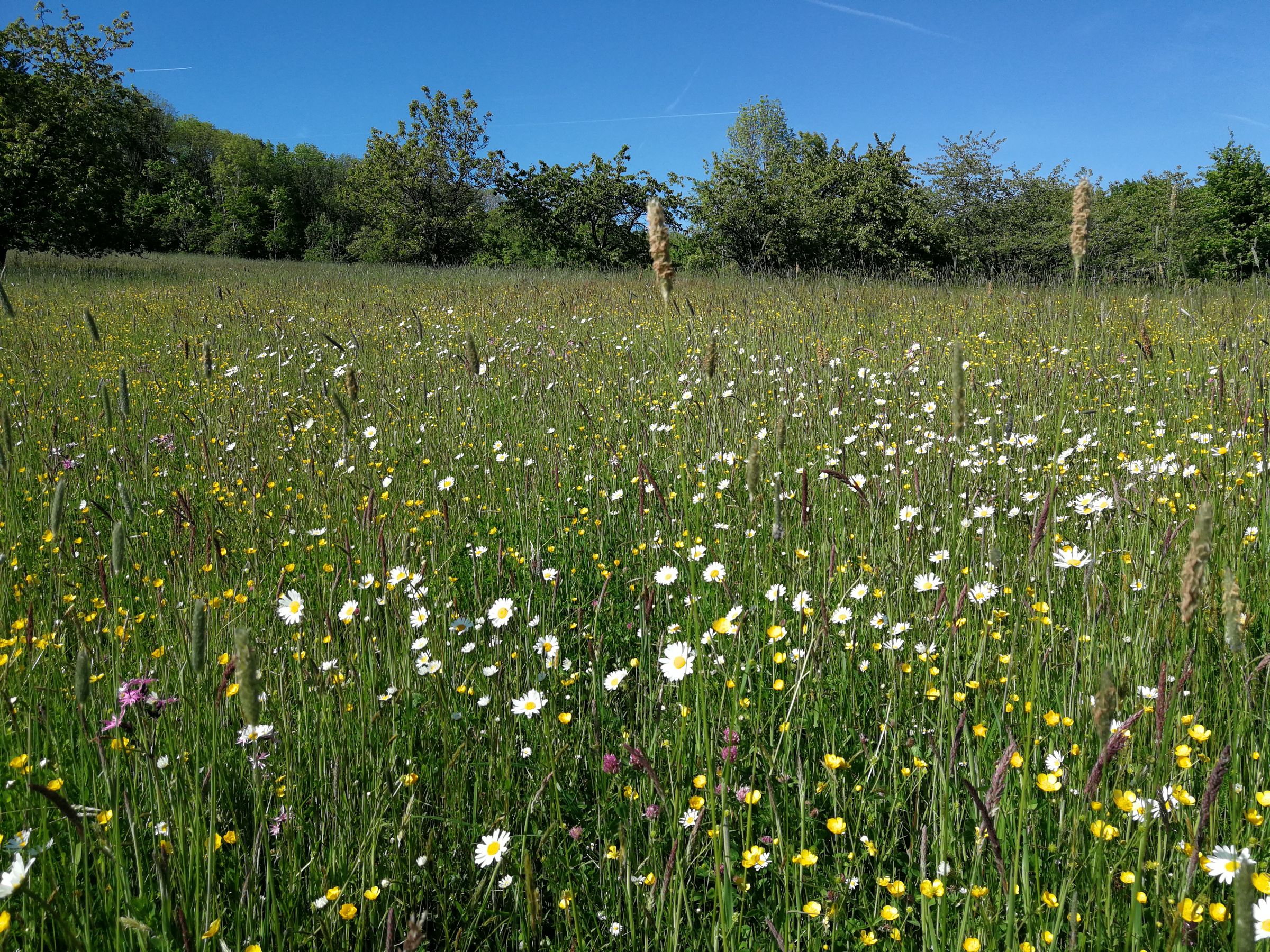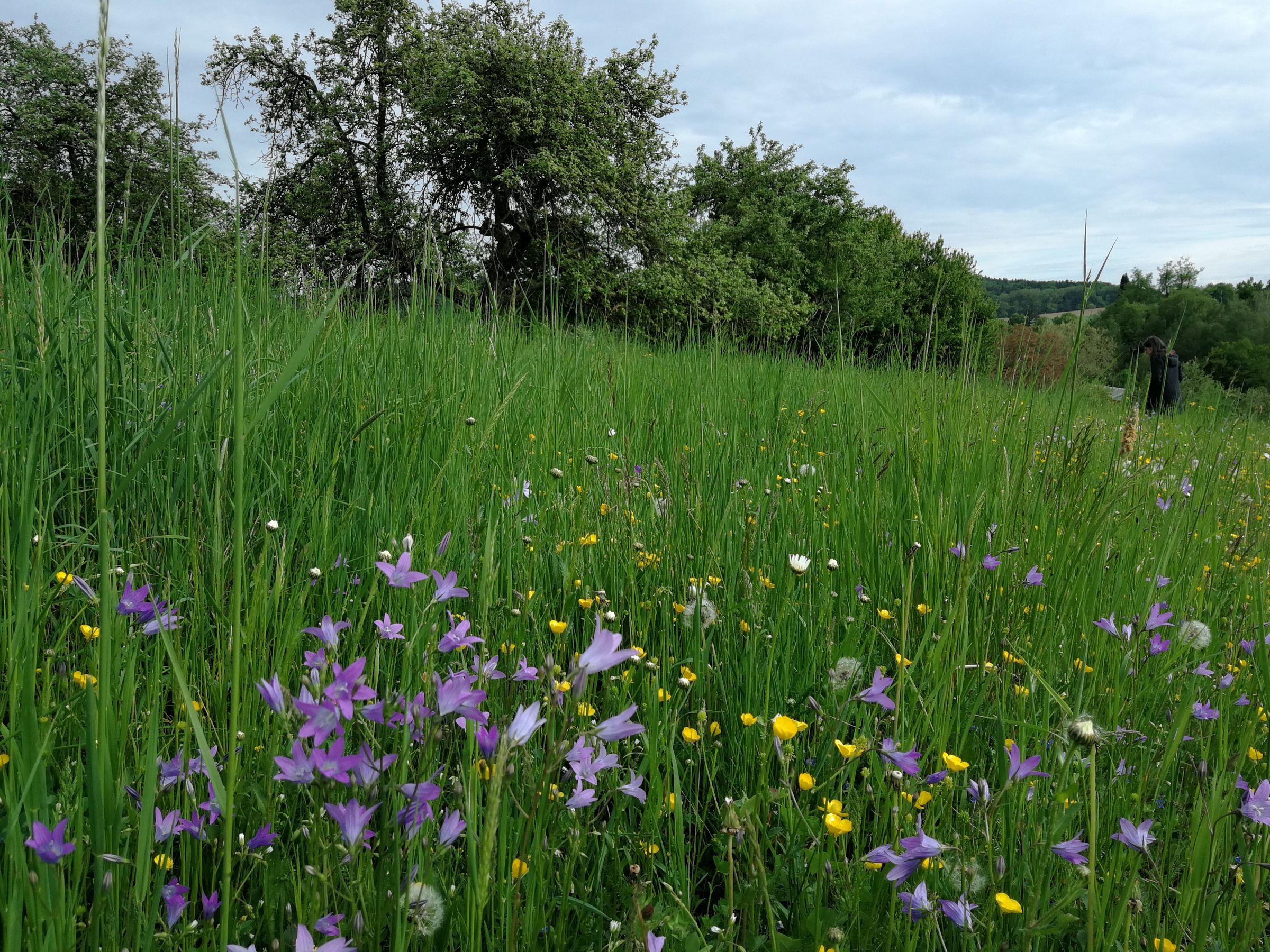 Die artenreiche Zweischnittwiese „Weizzeile“ ist knapp drei Hektar groß und in schöner Hanglage zwischen Heckenzeilen und altem Streuobst. Die Fläche hat keine Schnittzeitauflage, ist aber mit der Ökoregelung 5/Kennarten im Dauergrünland belegt. Kennzeichnende Arten sind hier Schafgarbe, Wiesenglockenblume, Margerite, Kleine Prunelle, Knöllchensteinbrech, Kuckuckslichtnelke, Hornklee u. a.