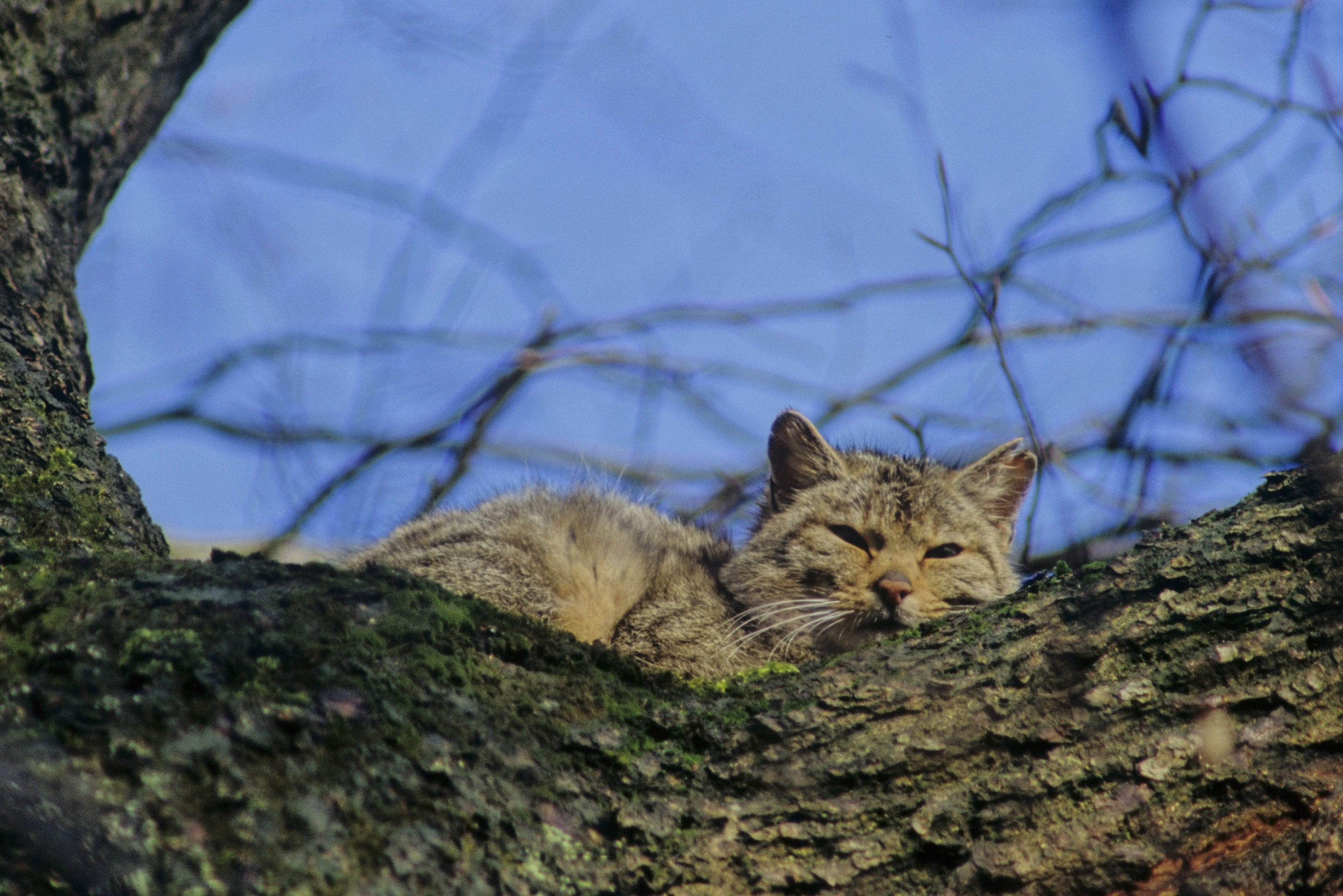 Die Wildkatze (Felis sylvestris) ist keine verwilderte Hauskatze, sondern eine eigene Katzenart. Sie ist eine scheue Waldbewohnerin, die große unzerschnittene Waldgebiete besiedelt. Dort nutzt sie gerne lichte Bestände oder Waldlichtungen, auf denen ihre Hauptnahrungsquelle, Waldmäuse, vorkommen. In Baum- oder Felshöhlen werden zwischen zwei und vier Jungtiere allein von der Mutter aufgezogen. Die Reviere sind bei den Männchen bis über 20 Quadratkilometer, bei den Weibchen bis 6 Quadratkilometer groß. Aktivitäten erfolgen sowohl tagsüber wie auch nachts und bevorzugt in der Dämmerung. Das wichtigste Unterscheidungsmerkmal zur Hauskatze ist der lange buschige Schwanz mit scharf abgesetzten schwarzen Ringen und einem schwarzen, stumpfen Ende. Meist wirkt sie auch insgesamt wuchtiger als Hauskatzen.
