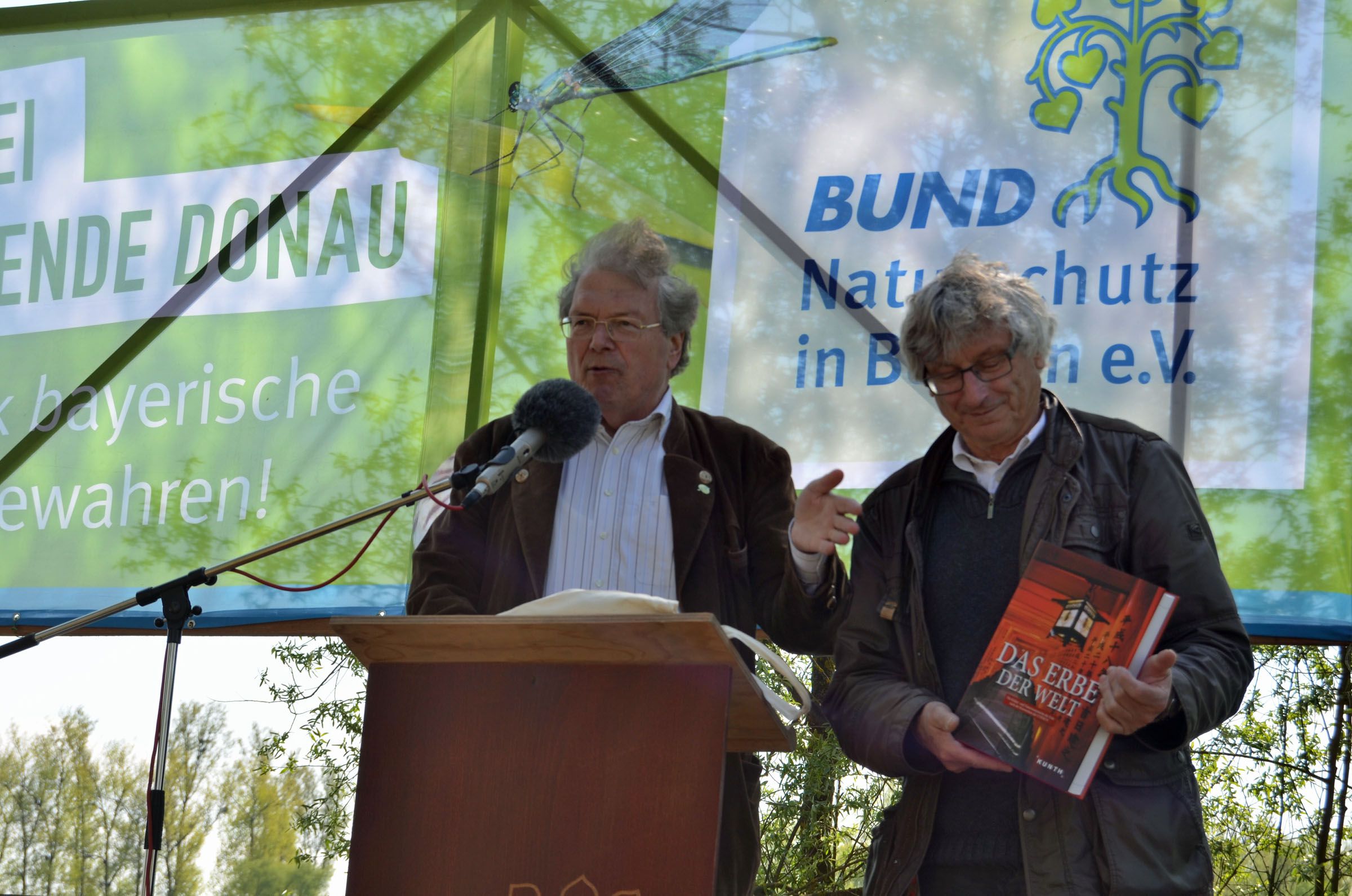 Einen besonderen Dank sprach Weiger an Dieter Scherf aus, der ebenfalls lange Jahre aktiv im Kampf für die Donau war. Er hatte sich bei der kürzlich in Deggendorf abgehaltenen BN-Vorstandswahl nicht mehr zur Verfügung gestellt. Scherf wird sich künftig dafür einsetzen, dass die niederbayerische Donauregion den Status als UNESCO-Welterbe erhält. Als Inspiration für seine Arbeit schenkte ihm Hubert Weiger ein dickes Buch über bereits bestehende Welterbestätten.