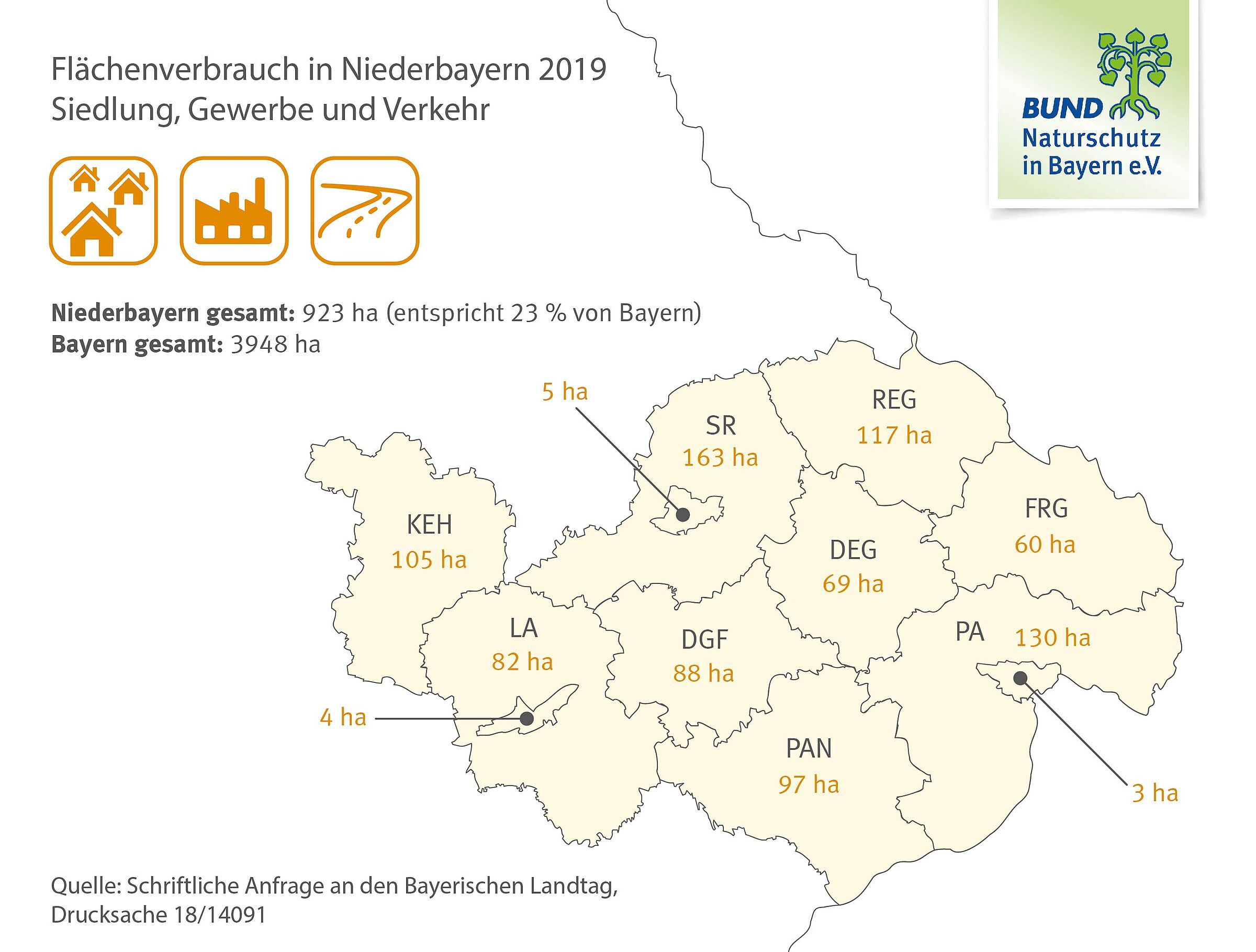 In Niederbayern besonders hervorzuheben ist der Einsatz des BN gegen übermäßigen Flächenverbrauch wie beim umstrittenen Sondergebiet Prassreut (Lkr. Freyung-Grafenau) und gegen überdimensionierten Straßenbau wie etwa die Ortsumfahrungen Schweinhütt, Ruhmannsfelden (Lkr. Regen) oder Geiselhöring (Lkr. Straubing).