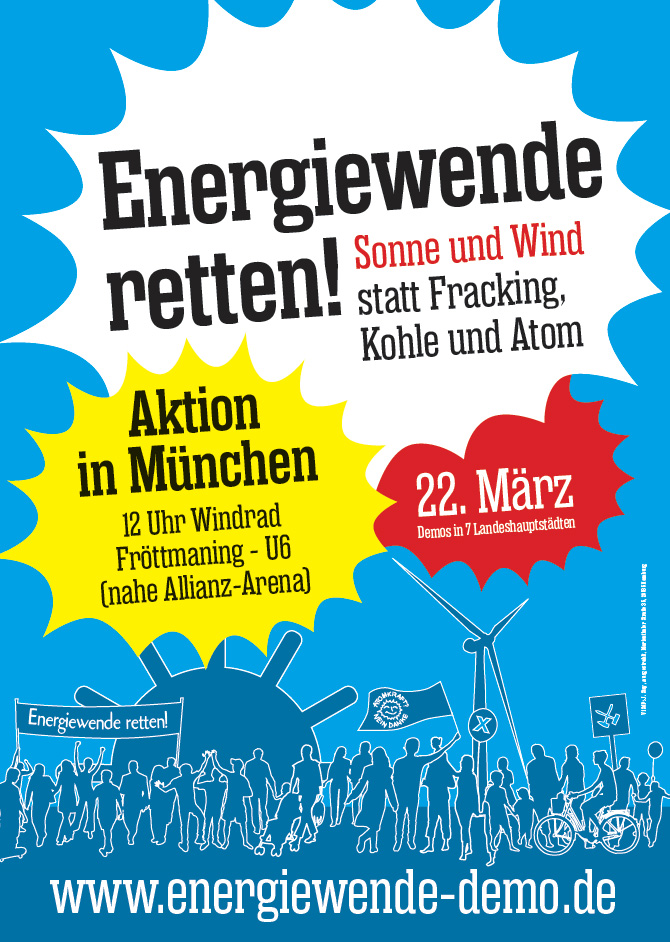 "Die Bayerische Staatsregierung hatte nach Fukushima in 2011 die Bayerische Energieagentur gegründet und die Energiewende zum Chefthema erklärt. Nach der Wahl 2013 wurde die Energieagentur wieder aufgelöst und die Bayerische Staatsregierung bremst die Energiewende aus. Das ist Energiepolitik gegen die Bürgerinnen und Bürger Bayerns! Das Wirtschaftsministerium ist das Sprachrohr der Industrieinteressen. Wir fordern Staatsministerin Ilse Aigner auf, dass das Wirtschaftsministerium sich aus dem Griff der Energieindustrie löst und zu einem Energieministerium für die Energiewende von Unten wird!" fordert Richard Mergner, Landesbeauftragter des BUND Naturschutz in Bayern. 5000 folgten dem Aufruf des breiten Bündnisses in Bayern am Samstag zur Kundgebung am Fröttmaninger Windrad in München unter dem Motto "Energiewende retten! - Sonne und Wind statt Kohle und Atom".