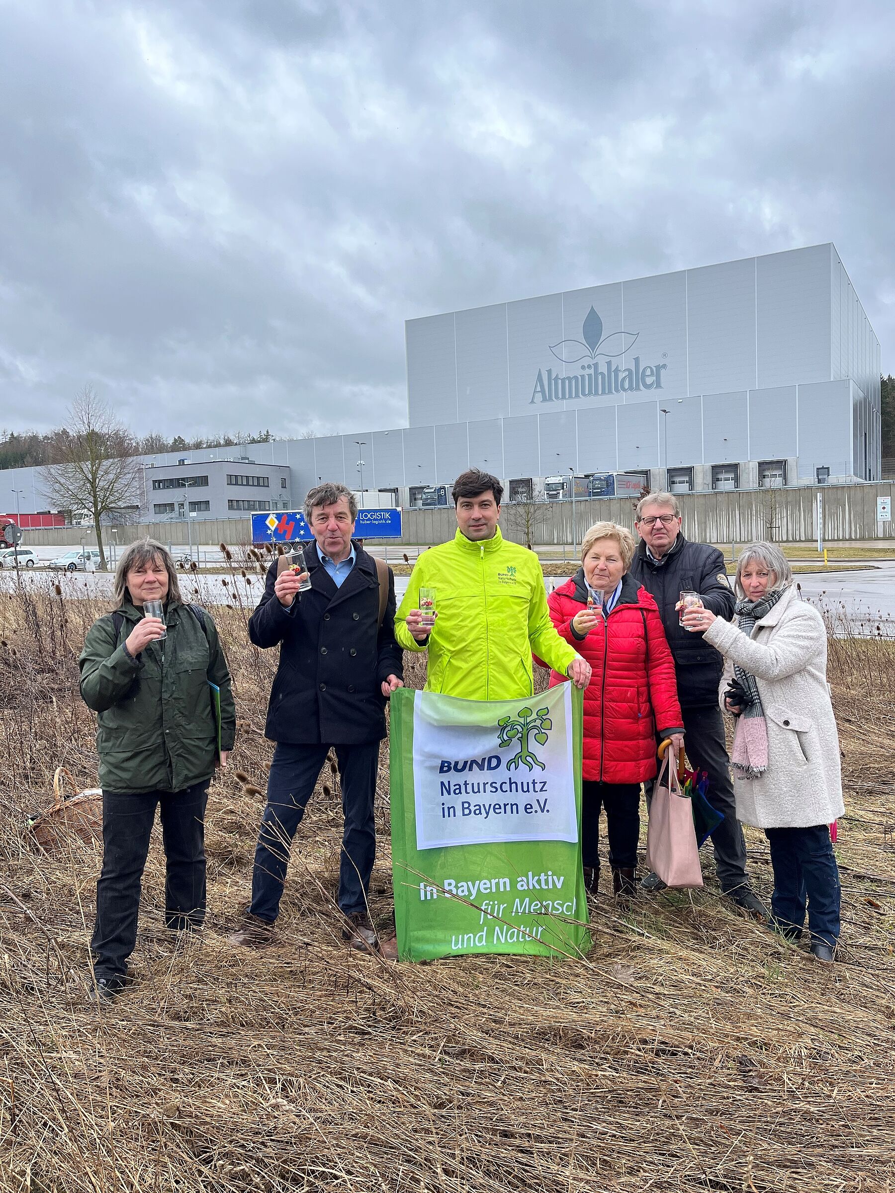 Altmühltaler ist Teil der Aldi-Nord-Gruppe, das Tiefengrundwasser würde also durch einen milliardenschweren Konzern ausgebeutet - für den BUND Naturschutz Grund zur massiven Kritik an diesem Vorhaben. In Sichtweite des riesigen Hochregallagers der Firma Altmühltaler südlich von Treuchtlingen stellten Vertreter*innen des BN und der Bürgerinitiative „Wassergruppe Treuchtlingen“ am Donnerstag ihre Position zur geplanten Tiefenwasser-förderung vor. Der BN-Landesbeauftragte Martin Geilhufe erklärte vor Ort: „Das hier über Jahrhunderte angesammelte Grundwasser ist besonders rein und muss in Zeiten der Klimakrise und immer stärkeren Trockenzeiten der kommunalen Trinkwasserversorgung als Reserve dienen. Wir lehnen in ganz Bayern eine dauerhafte Tiefengrundwasserförderung durch private Wasserabfüller ab. Es kann nicht sein, dass sich privatwirtschaftliche Unternehmen an einem allgemeinen Gut wie Wasser bereichern, zumal die Verteilungskämpfe um das Wasser auch in Bayern bereits begonnen haben.“