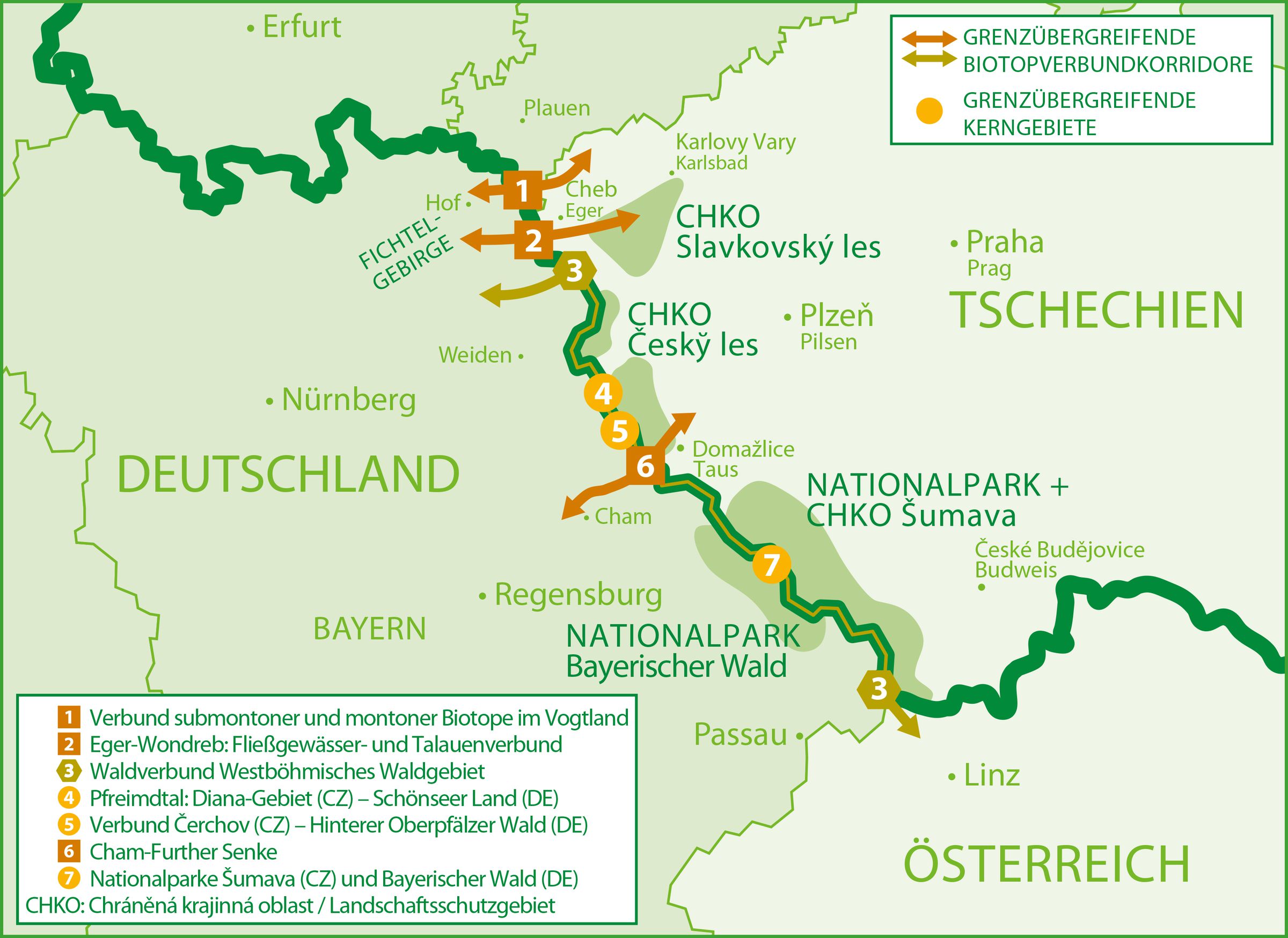 Das Treffen fand im Projektbüro Grünes Band des BUND Naturschutz in Bayern e.V. (BN) statt. Während einer Exkursion zum Grünen Band Bayern-Tschechien im Bereich des Oberpfälzer Waldes/Český les wurde dessen Bedeutung als Bestandteil des europäischen Lebensraumverbundes unterstrichen. In Zeiten wachsender Europa-Verdrossenheit steht das Grüne Band Europa wie keine weitere Initiative für die Umsetzung des europäischen Gedankens. Der über 12.500 Kilometer lange Lebensraumverbund entlang des ehemaligen Eisernen Vorhangs ist ein herausragendes Beispiel für grenzübergreifenden Naturschutz. Das 346 Kilometer lange Grüne Band Bayern-Tschechien ist ein wichtiger Teil des zentraleuropäischen Abschnitts dieses längsten ökologischen Korridors der Welt. Der BN setzt sich hier seit Langem für grenzüberschreitende Kooperation, die Zusammenarbeit mit Gemeinden und lokalen Akteuren sowie den Ankauf wertvoller Flächen zur langfristigen Sicherung für den Arten- und Klimaschutz ein.