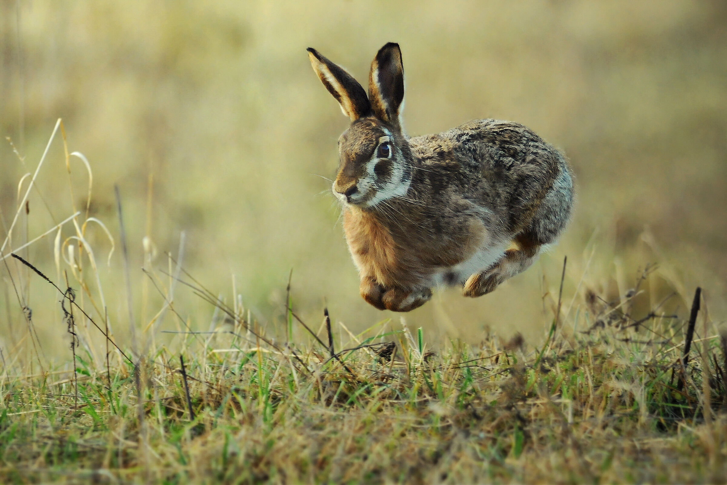 Der Feldhase ist ein Tier mit beeindruckenden Fähigkeiten: Er ist ein Meister der Tarnung mit hervorragendem Gehör. Durch seine langen, kräftigen Hinterbeine ist der Feldhase sehr flink: Auf der Flucht erreicht er Geschwindigkeiten von etwa 50 km/h, kurzzeitig sogar bis zu 70 km/h – das ist schneller als ein Rennpferd im Galopp! Dabei schlägt er 90-Grad-Haken und kann bis zu drei Meter hoch und sieben Meter weit springen. Um die Damen zu beeindrucken, liefern sich die männlichen Hasen in der Paarungszeit spektakuläre Boxkämpfe und Wettrennen. Übrigens: Vom Wildkaninchen kann man den Feldhasen durch seine deutlich größeren Ohren unterscheiden.