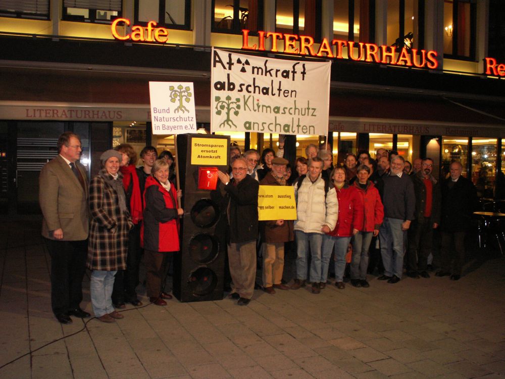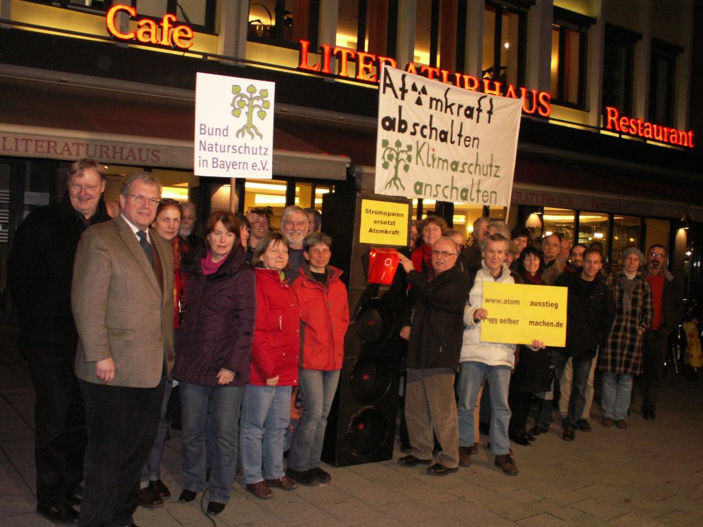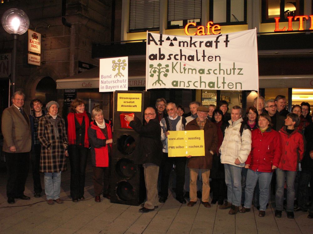 Mit einem großen Modell einer Steckerleiste mit Kippschalter zeigten mittelfränkische Natur- und Umweltschützer gestern Abend in Nürnberg, wie Jede und Jeder den Atomausstieg und den Klimaschutz voranbringen kann.