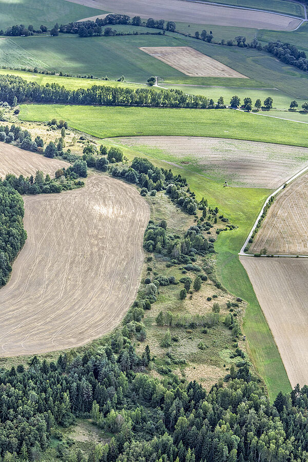 Das Grüne Band zieht sich als grüner teils bewaldeter Streifen zwischen braunen und grünen Feldern hindurch. (Foto: Klaus Leidorf)