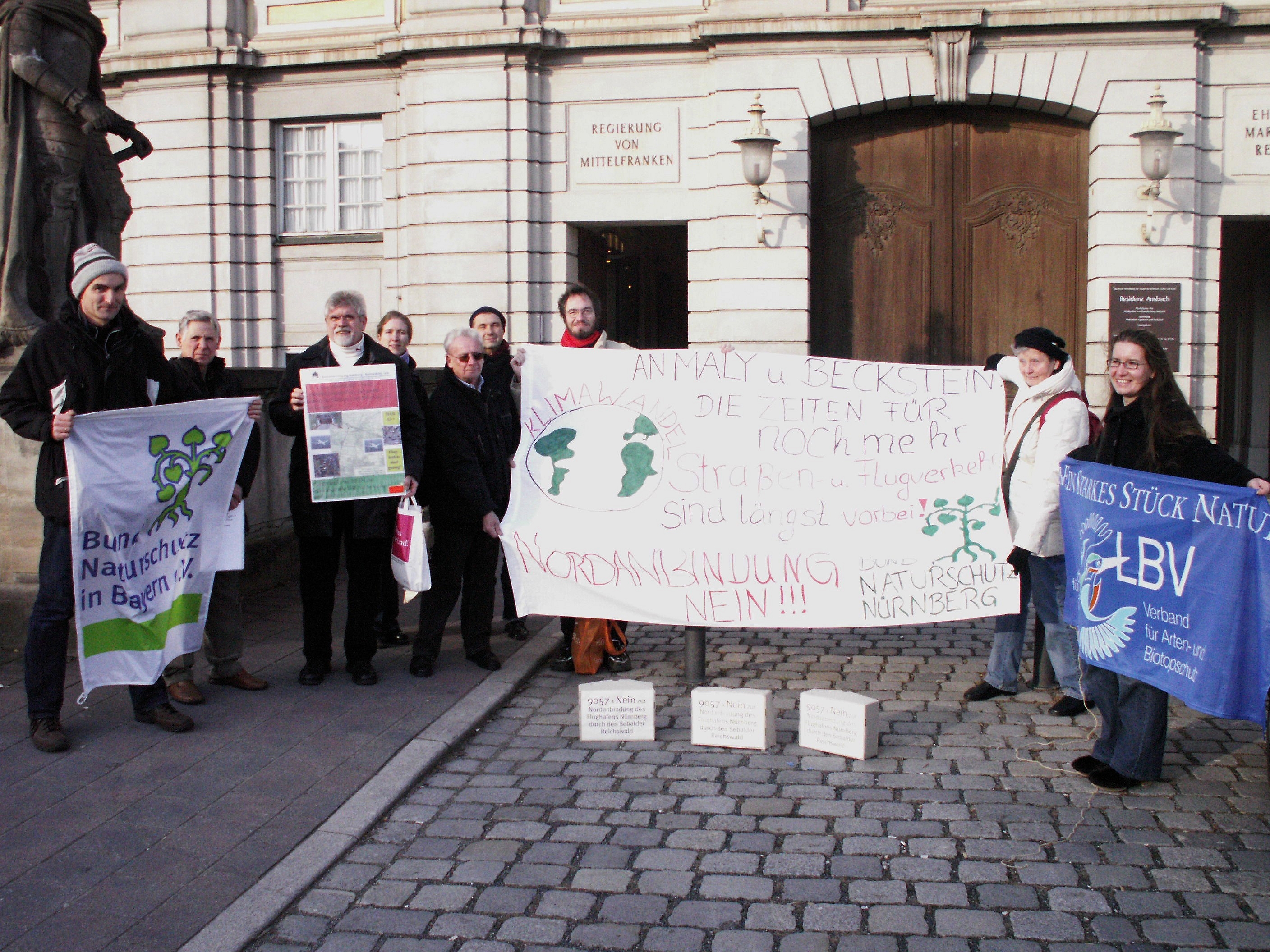 Mitglieder des "Aktionsbündnisses gegen die Nordanbindung des Flughafens" überbrachten die Kartons mit den Listen der Regierung von Mittelfranken und wurden dabei von Regierungsdirektor Klaus Keppeler, Leiter des Sachgebietes "Straßenrechtliche Planfeststellungsverfahren", empfangen. Sie übergaben darüber hinaus Stellungnahmen der Verbände, die die rechtlichen Belange dezidiert behandeln und zu einer fundierten Ablehnung führten.