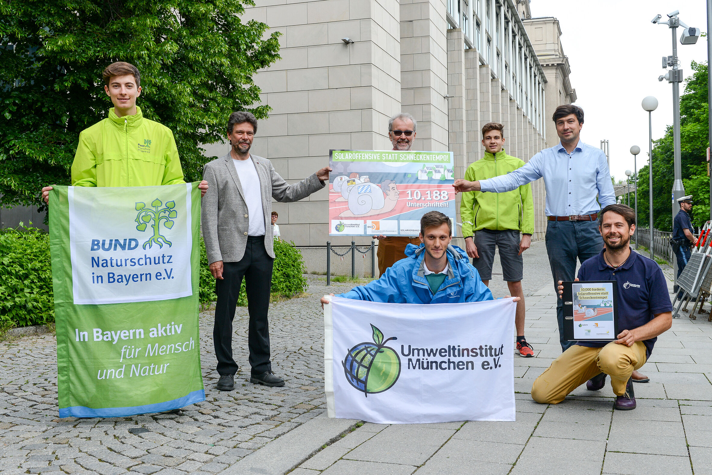 Die Initiator*innen der Aktion vom Umweltinstitut München e.V., dem BUND Naturschutz in Bayern e.V., dem Solarverband Bayern e.V. und der Deutschen Gesellschaft für Sonnenenergie e.V. überreichten die gemeinsam gesammelten Unterschriften an die Staatskanzlei.