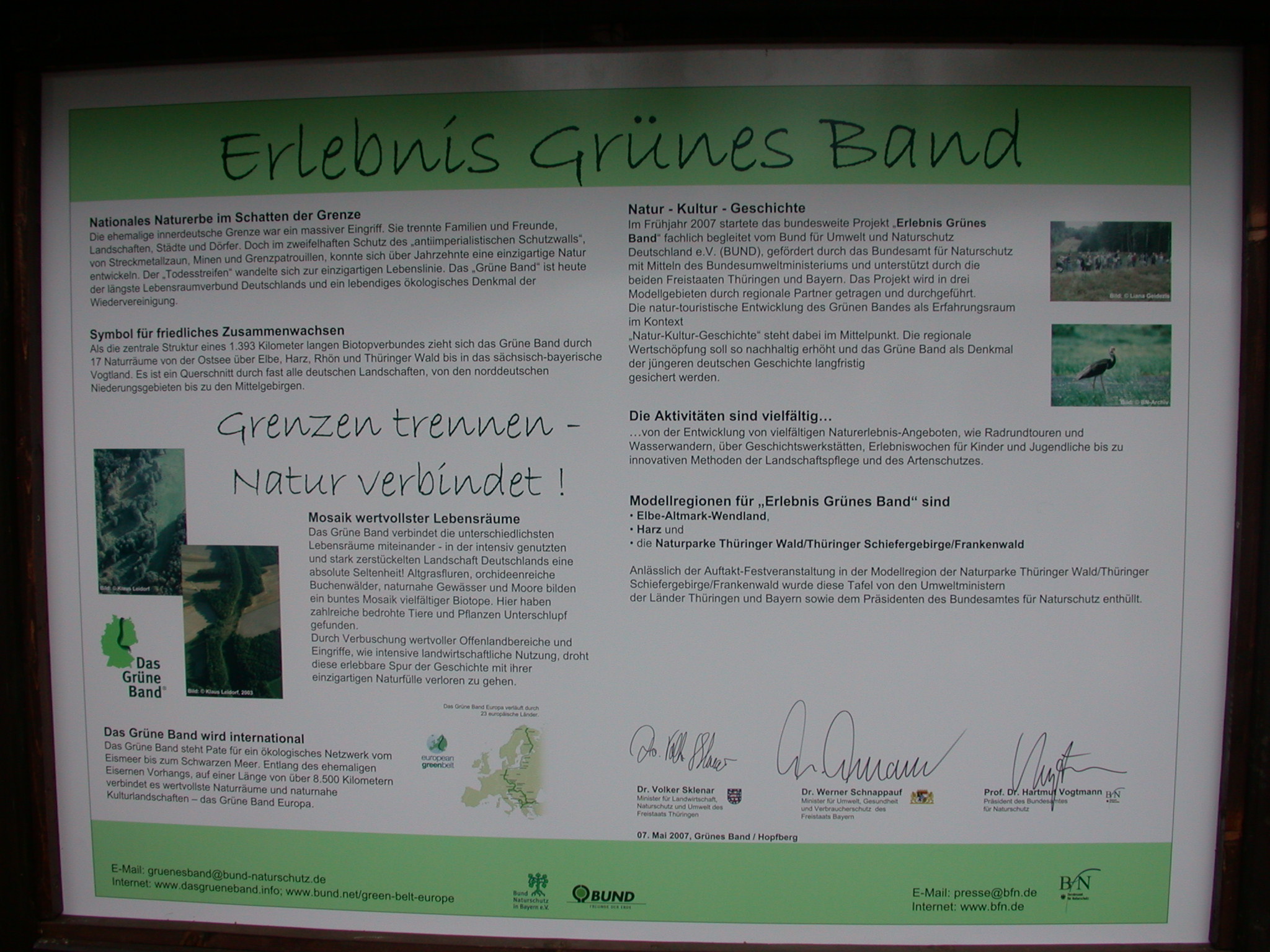 Das dreijährige Vorhaben “Erlebnis Grünes Band“ wird von regionalen Partnern durchgeführt und vom BUND-Projektbüro Grünes Band wissenschaftlich begleitet. Es ist deutschlandweit eines der bedeutendsten Projekte zum Schutz und zur naturverträglichen touristischen Entwicklung wertvoller Naturräume. Die Natur und das historische Erbe entlang der einstigen innerdeutschen Grenze sollen dabei geschützt, belebt und für Touristen besser erlebbar gemacht werden. Neben dem Harz und der Region Elbe-Altmark-Wendland, ist die Modellregion der Naturparke Thüringer Wald, Thüringer Schiefergebirge/Obere Saale und Frankenwald, eines der Gebiete, in denen das Projekt exemplarisch umgesetzt wird.