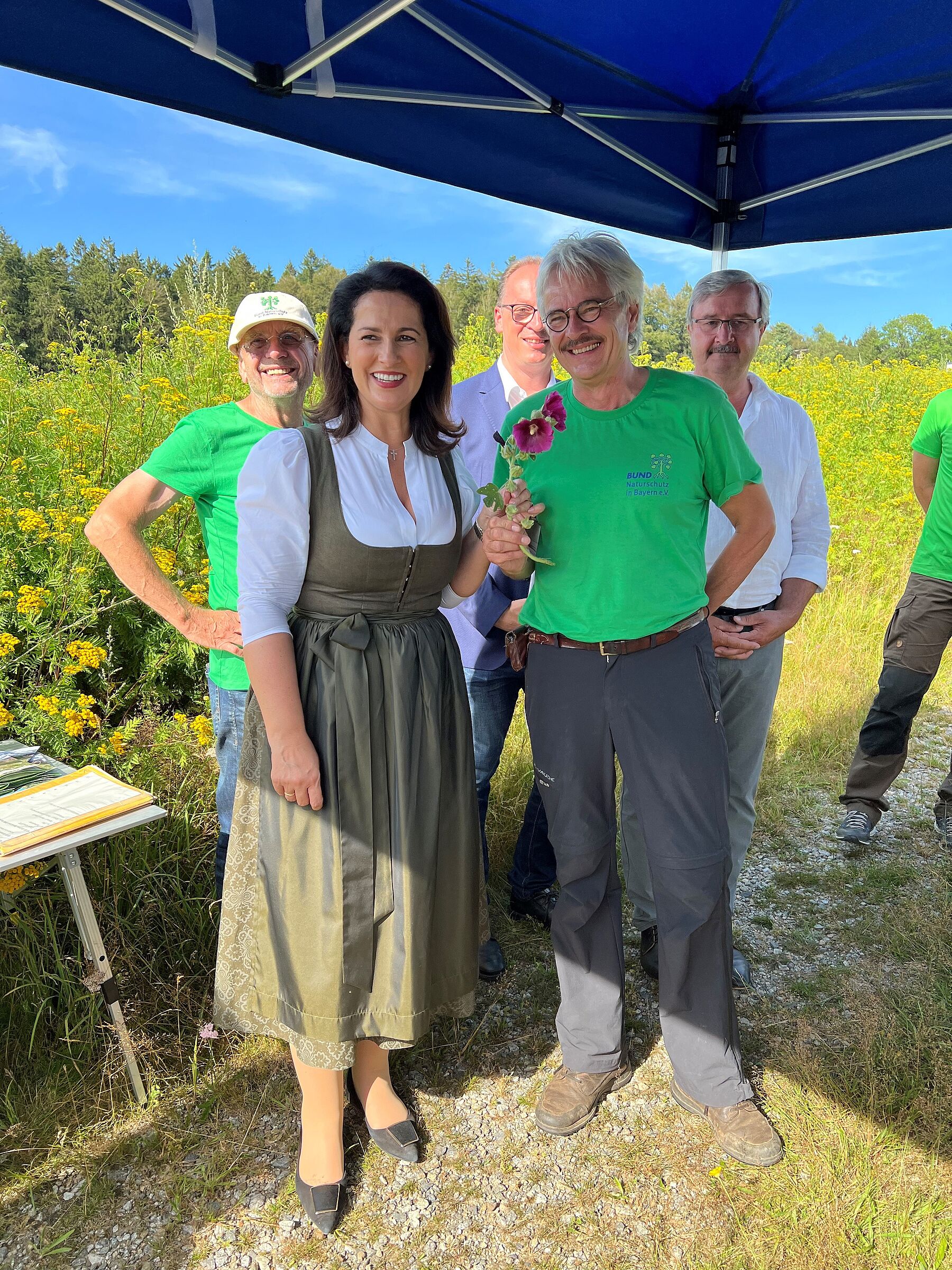 Biodiversität und Bodenschutz durch mehrjährige blühende Energiepflanzen: Der Besuch der Gemeinde Hinterschmiding mit der Staatsministerin war vor allem vor dem Hintergrund der letzten Hochwasserereignisse interessant. Seit 2021 wird dort über das Projekt „Quervernetzung Grünes Band“ auf mittlerweile rund 5,5 Hektar Ackerfläche ein Mix aus mehrjährigen blühenden Energiepflanzen wie Sonnenblume, Lein und Rainfarn statt Energie-Mais angebaut. Dies schafft ökologische Vernetzungsflächen für Insekten und Vögel in der Agrarlandschaft und sorgt für Bodenschutz. Das Projekt wurde vom Bayerischen Naturschutzfonds mit mehr als 500.000 Euro kofinanziert.