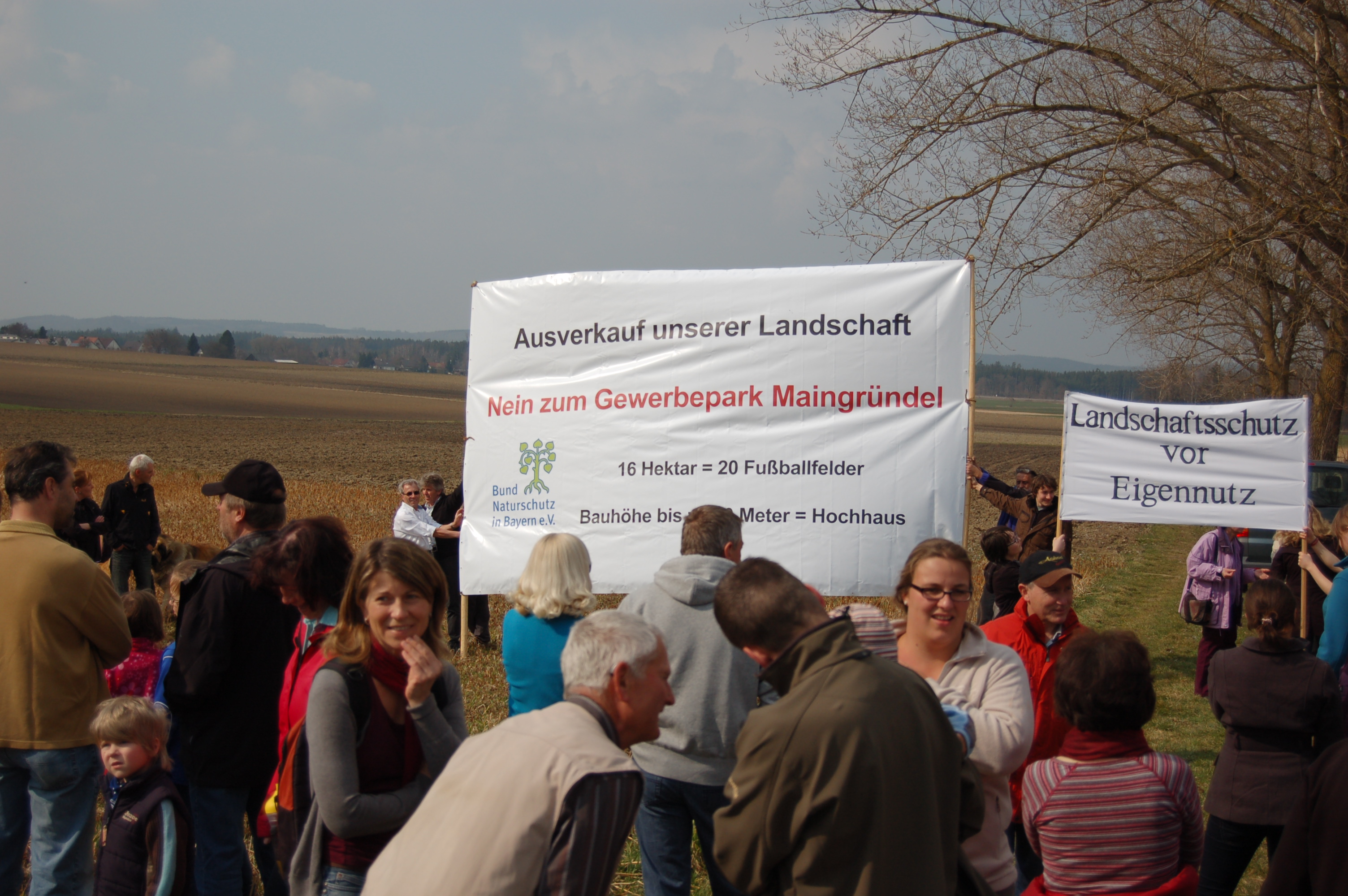 Etwa 150 Personen fanden sich am Samstag, den 24.3.2012 zu einer Protestaktion bei den Flächen des geplanten Gewerbeparks Maingründel ein, um Ihre Ablehnung der Planungen zum Ausdruck zu bringen.