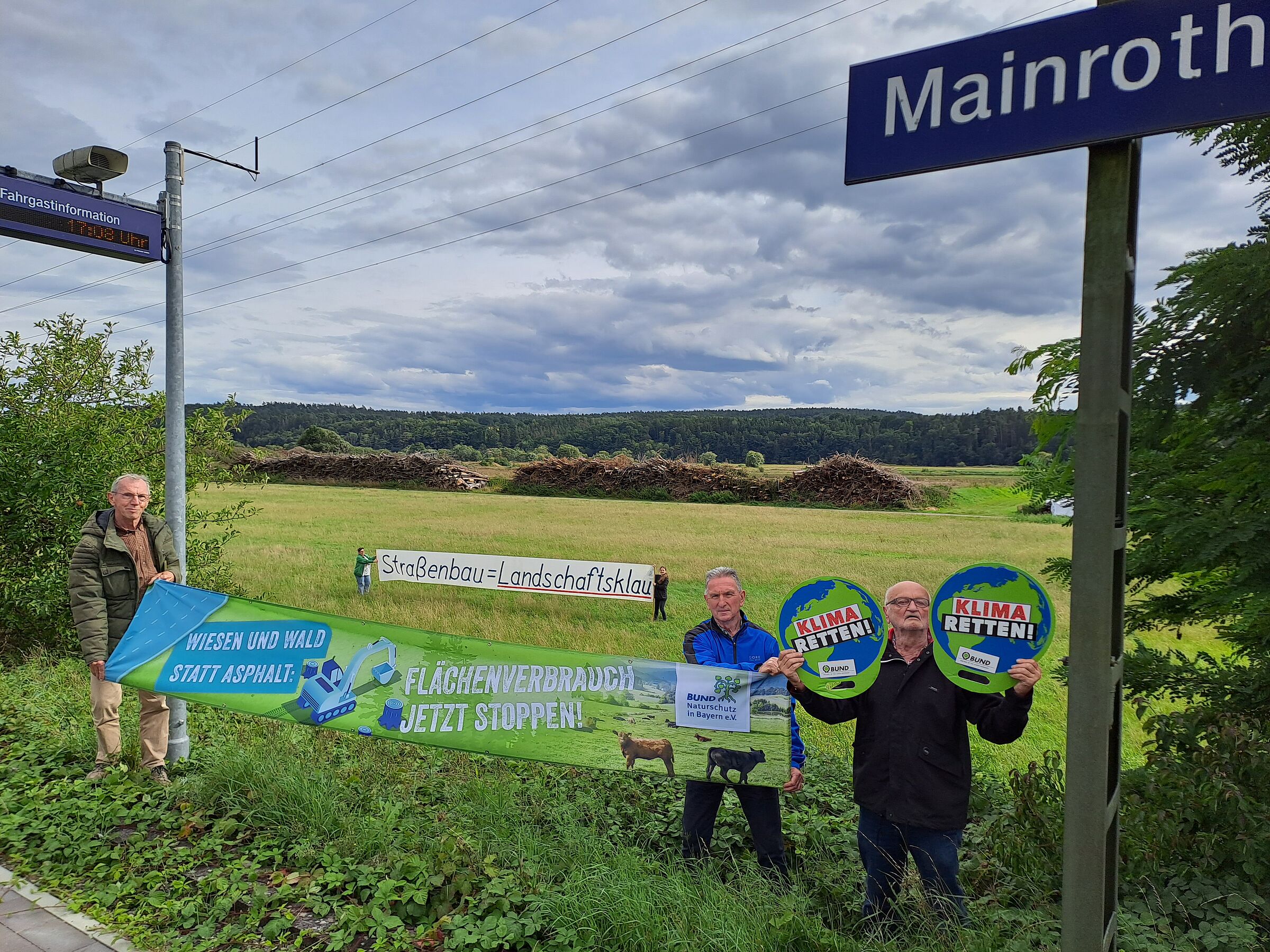 Vertreter des BUND Naturschutz in Bayern e.V. (BN) haben sich bei einem Ortstermin am Bahnhof von Mainroth die vom Staatlichen Bauamt Bayreuth geplante Ortsumgehung der B 289 vor Augen geführt. Am sogenannten Bahnhof mit „Bedarfshalt“ bot sich ein eigenartiges Stimmungsbild, das die BN-Gruppe betroffen machte: Es gibt keine Wartehäuschen, die vor Wind und Regen schützen; keine Abfahrtstafeln; keine Fahrtrichtungsanzeiger; keine Fahrradständer und keinen Fahrkartenautomaten. Hinzukommt eine gefahrenträchtige Querung der Gleise. Unterm Strich ist das kein attraktiver und bürgerfreundlicher Bahnanschluss. Und das bei einem Dorf mit knapp über 500 Einwohnern. Anstatt den Bahnhof zu ertüchtigen, soll aber für über 50 Millionen Euro parallel zur Bahnlinie eine knapp 4,7 km neue Straße von Mainklein bis nach Schwarzach entstehen, die die bestehende Bahnstrecke zweimal quert und rund 23 ha Fläche dauerhaft versiegeln wird.