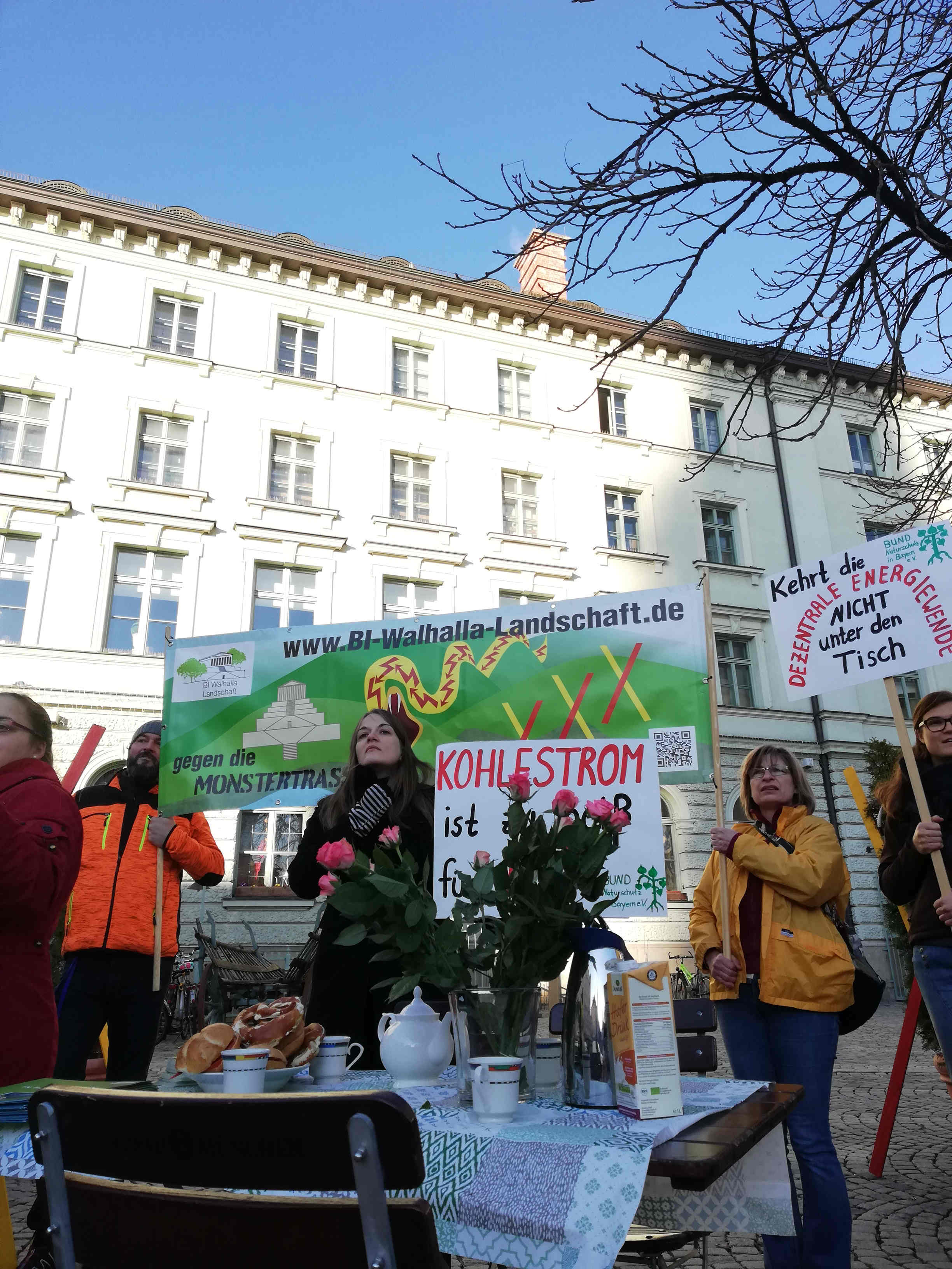 Der BN lädt neben dem TenneT Frühstück MdLs zum Frühstück unter freiem Himmel ein, um über das für und wider von Trassen zu diskutieren. (Bild: Penelope Kemekenidou)