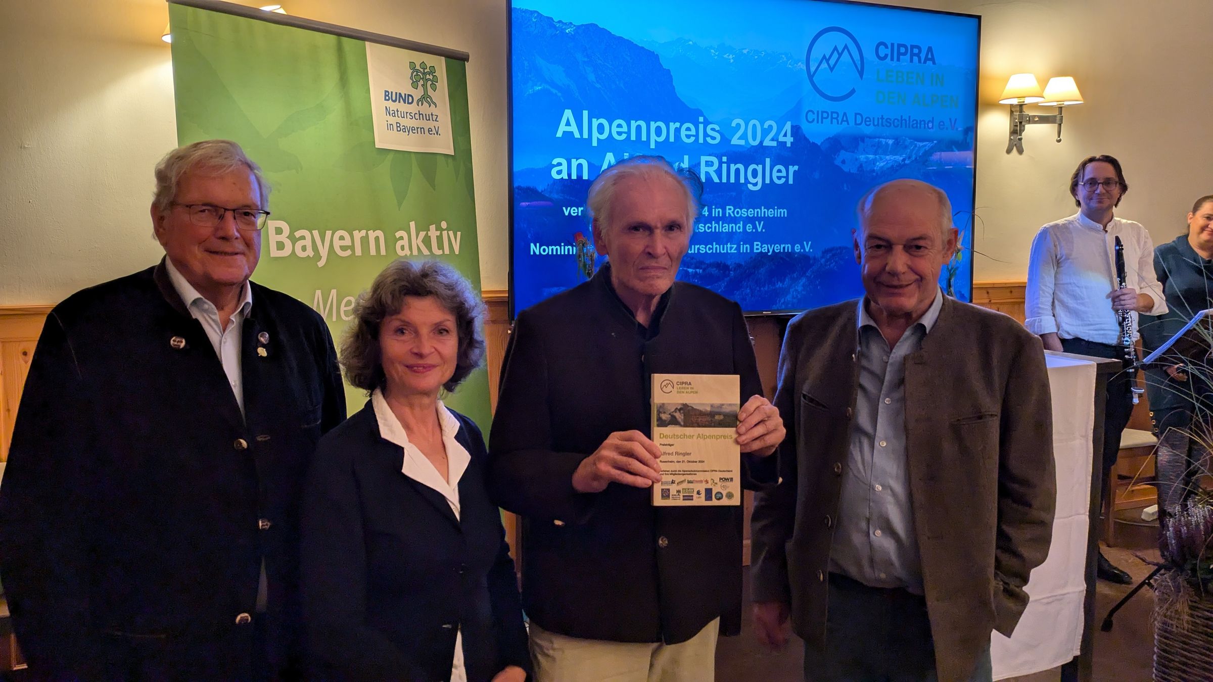Der Deutsche Alpenpreis wurde in diesem Jahr auf Vorschlag des BUND Naturschutz in Bayern e.V. (BN) verliehen. Die Verleihung fand am 21.10.2024 um 18:00 Uhr im Maikeller „Tante Paula“, Schmettererstraße 20, in Rosenheim statt. Die Laudatio hielt Prof. Dr. Hubert Weiger, Ehrenvorsitzender des BN.