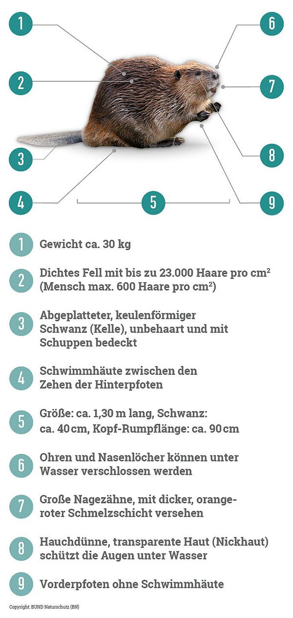 - Gewicht: ca. 30 Kilogramm; ein Biber kann damit schwerer als ein Reh werden