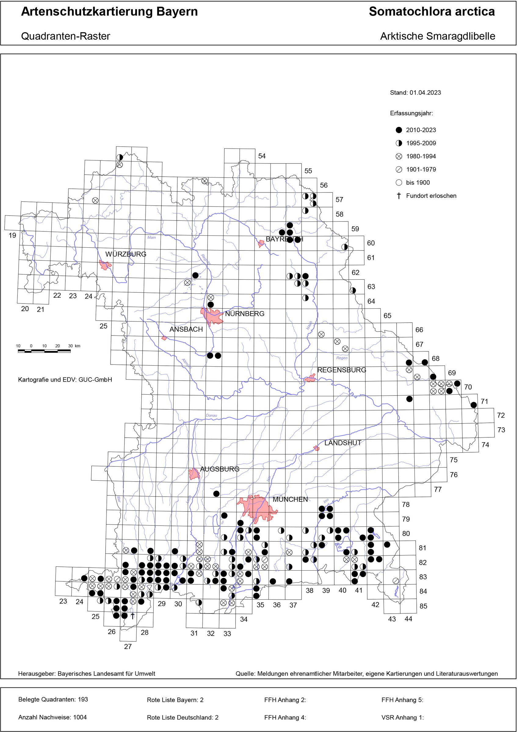Die Arktische Smaragdlibelle findet man in Südbayern im voralpinen Hügel- und Moorland und dem Alpenraum, vorwiegend im westlichen Teil. In Nordbayern sind nur vereinzelte Vorkommen im Vogtland, Thüringisch-Fränkischen Mittelgebirge, Fränkischen Keuper-Lias-Land, Oberpfälzischen Hügelland und in der Rhön bekannt. Gelegentlich findet man die Art auch im Inneren Bayerischen Wald.