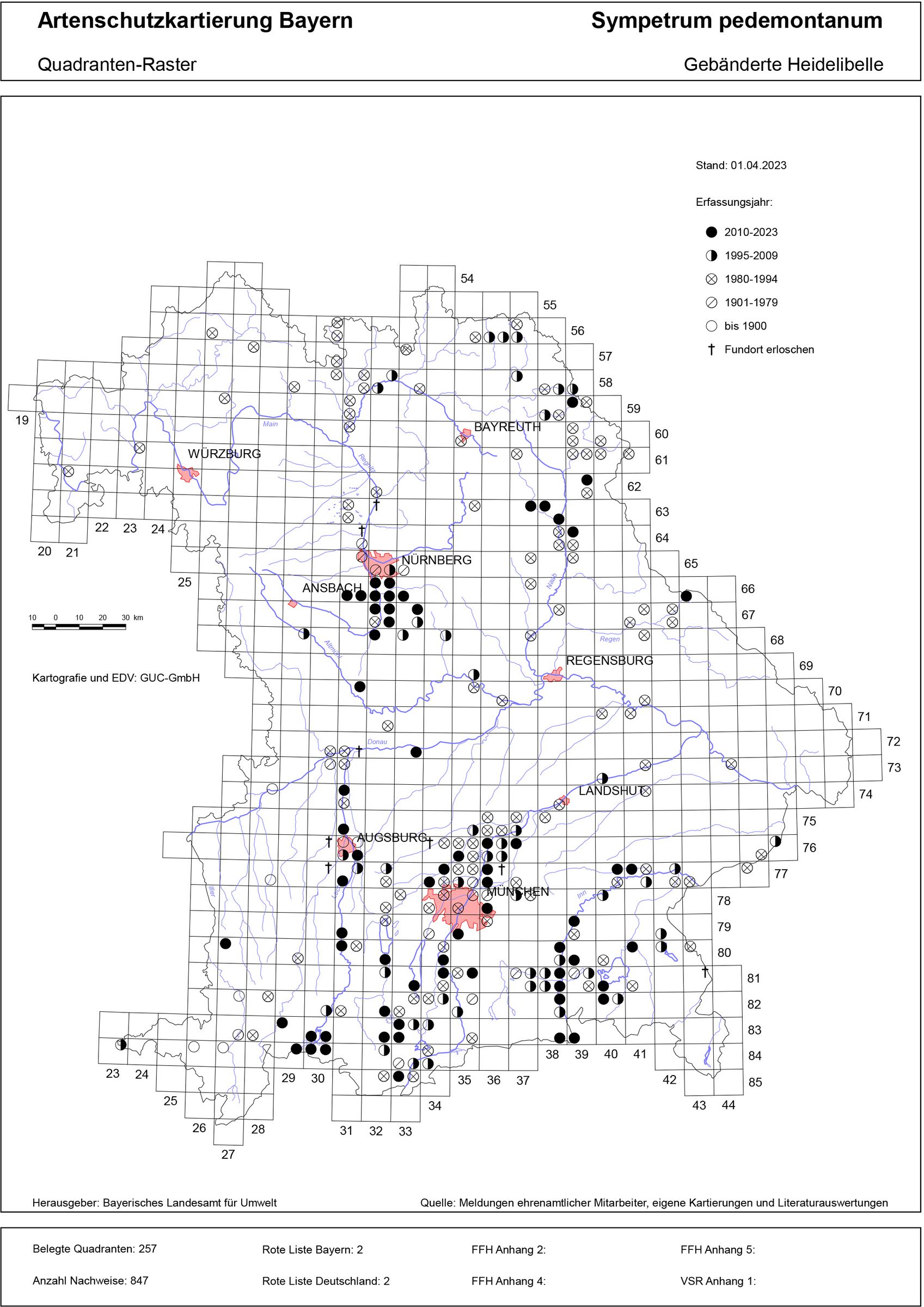 Am häufigsten ist die Gebänderte Heidelibelle (Sympetrum pedemontanum) in Flusstälern anzutreffen, vor allem entlang von Lech, Isar, Inn, Amper, Naab oder Rednitz. Entlang der Donau scheint die Art weitestgehend zu fehlen, abseits der Täler liegen nur wenige Fundorte. Besiedelt werden häufig vom Menschen geschaffene Gewässer wie Wiesengräben oder Sandgruben.