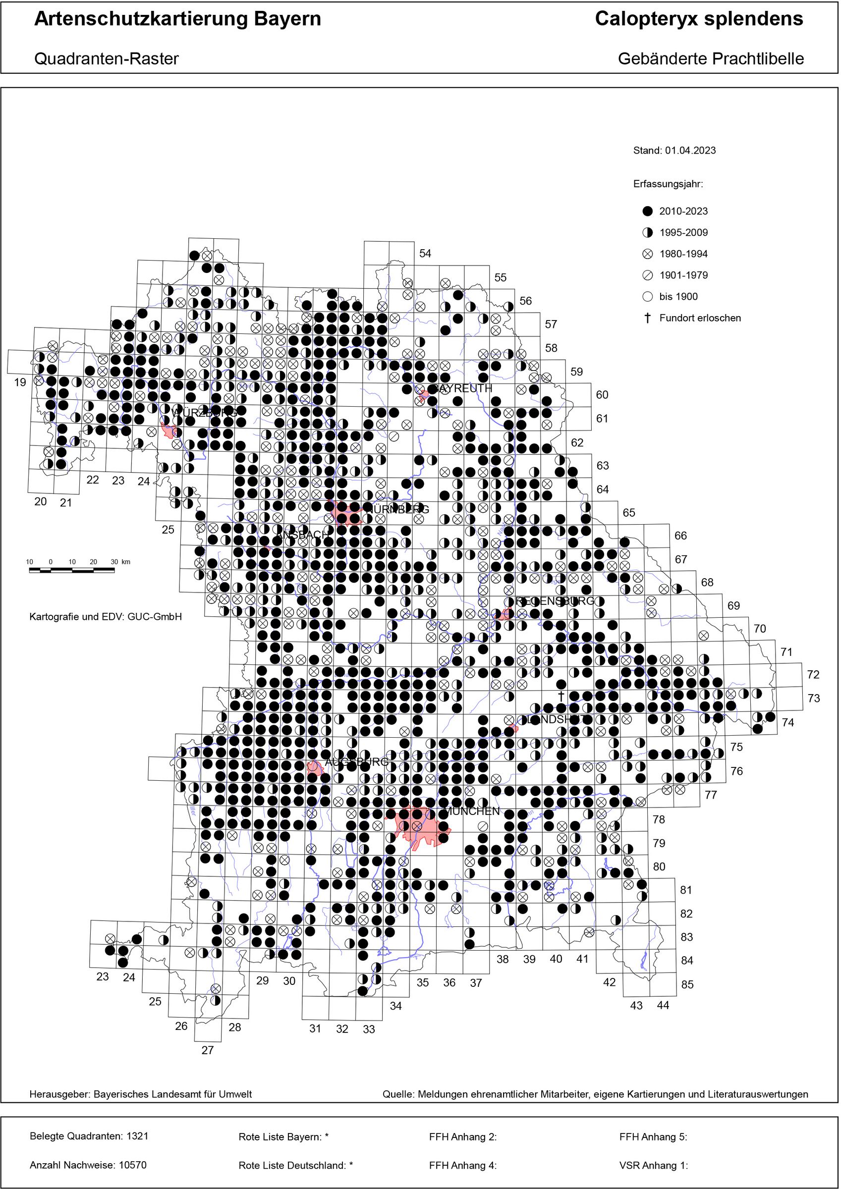 Die Gebänderte Prachtlibelle (Calopteryx splendens) zählt in Bayern zu den häufigsten Fließwasserlibellenarten. Sie profitierte enorm von der in den vergangenen Jahrzehnten dank Kläranlagen verbesserten Gewässergüte. Gut besonnte Flüsse, Bäche und Gräben, die eine gewisse Fließgeschwindigkeit aufweisen, zählen zu ihren bevorzugten Lebensräumen. An Stillgewässern ist die Gebänderte Prachtlibelle manchmal nach längeren Flügen als Gast anzutreffen oder auch mitten im Wald, wo die jungen Imagines abseits vom Gewässer eine Reifephase durchmachen. Durch Zeitlupenaufnahmen ist ihr hoch komplexes Paarungsverhalten mit Droh- und Balzflügen wie bei der Schwesterart Blauflügel-Prachtlibelle sehr gut dokumentiert. Ihr für Libellen recht langsamer, schmetterlingshafter Flug und die auffällig blau-metallische Färbung machen sie zu einer sehr auffälligen Art.