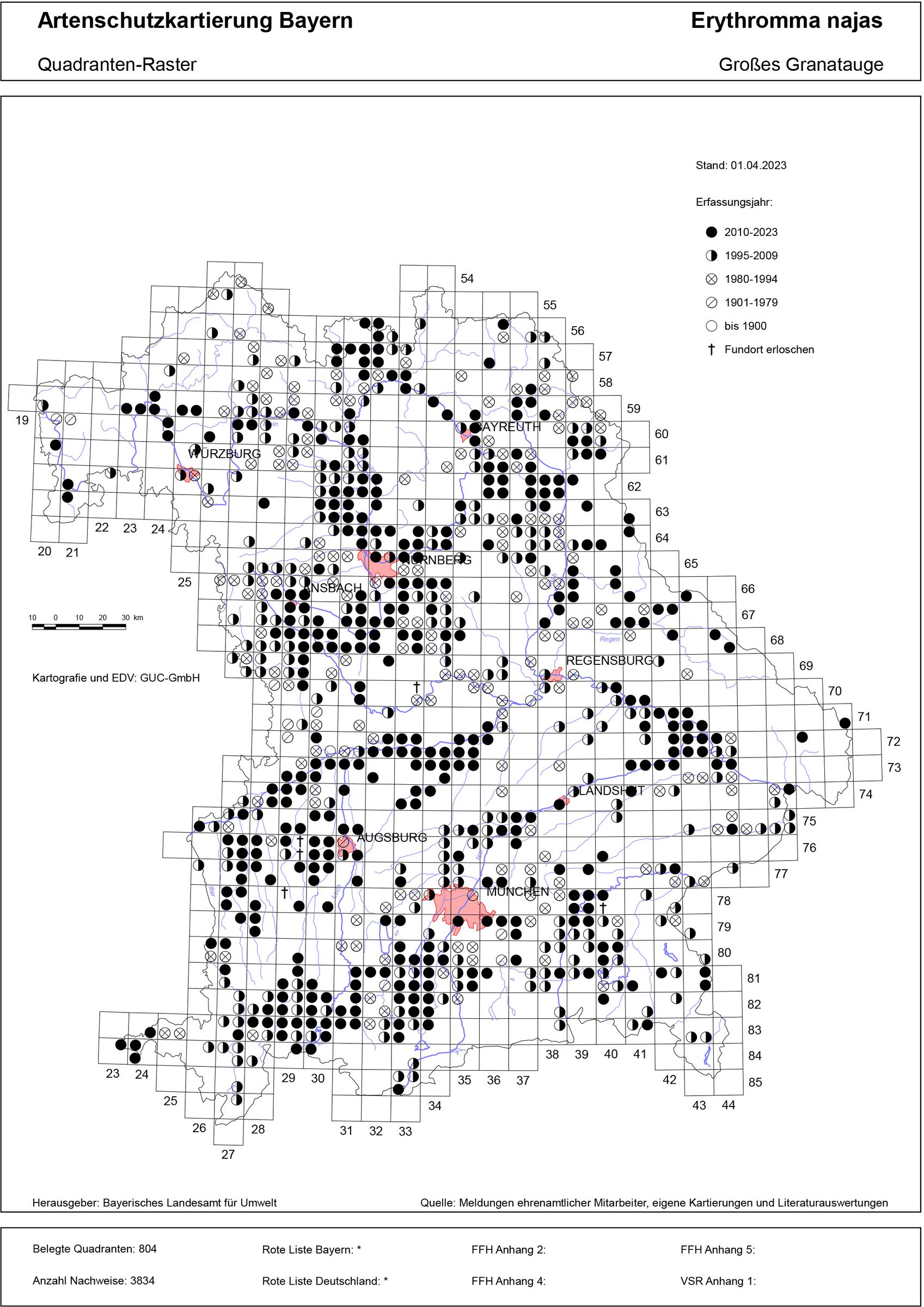 Das Große Granatauge (Erythromma najas) besiedelt bevorzugt Stillgewässer mit Schwimmblattbeständen, die Art ist mäßig häufig in Bayern verbreitet, Schwerpunkte finden sich in Flussniederungen. Grundsätzlich ist das Große Granatauge anspruchsvoll, was ihre Fortpflanzungsgewässer betrifft, sie braucht ausgeprägte Schwimmblattfluren.