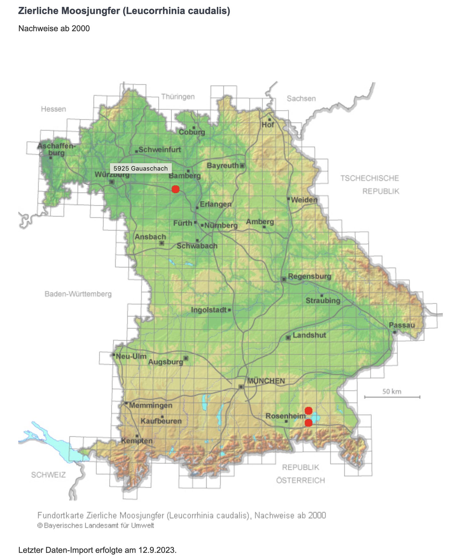 Die Zierliche Moosjungfer ist bayernweit akut vom Aussterben bedroht. Ihre bevorzugten Lebensräume sind häufig schwer zugänglich, die Art wird daher leicht übersehen.