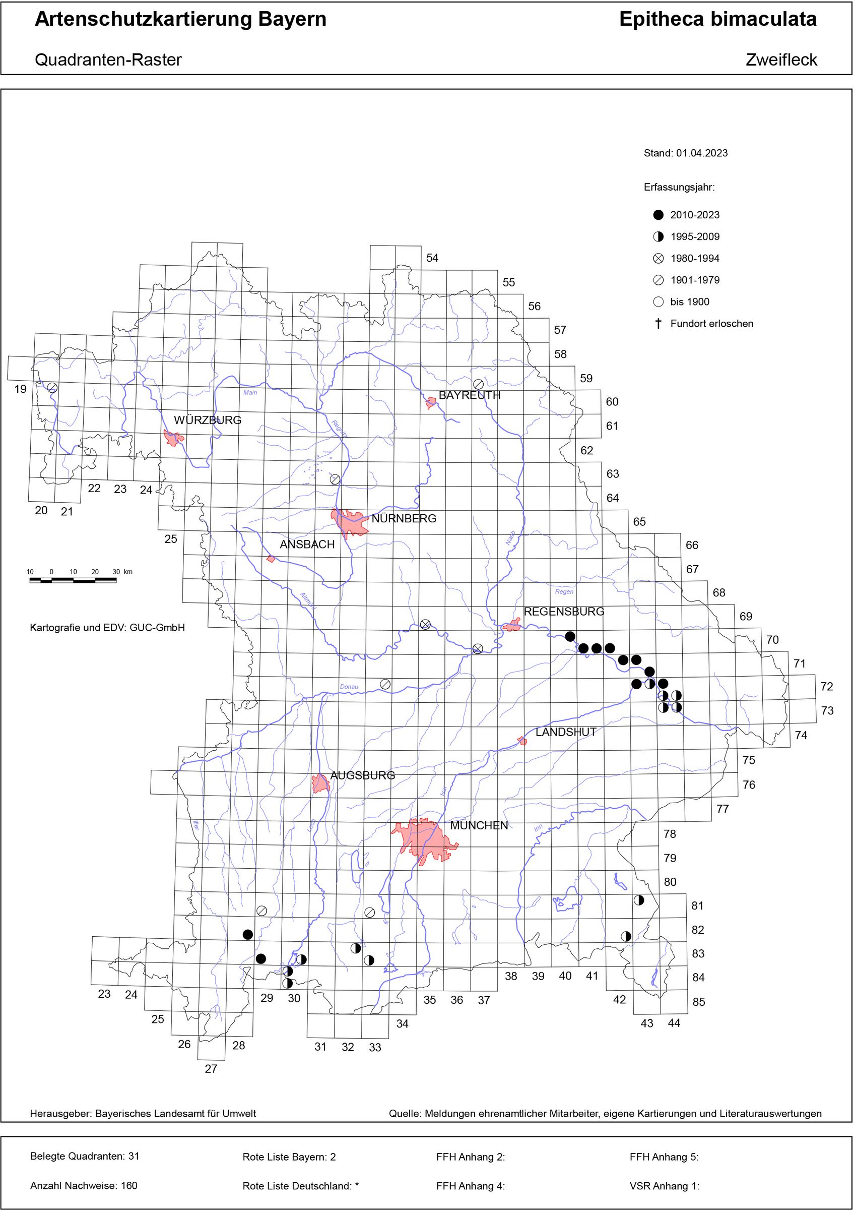 Zwischen den 1950er- und 1990er-Jahren galt der Zweifleck in Bayern als verschollen, danach wurden infolge gezielter Suche etliche Vorkommen im Raum zwischen Regensburg und Vilshofen entdeckt. Aus dem bayerischen Alpenvorland gab es zuletzt nur Einzelfunde: Da die Art im benachbarten Baden-Württemberg an Weihern auftritt, wäre hier eine gezielte Nachsuche anzustreben. Die aktuelle Rote Liste Bayern (2018) stuft den Zweifleck als „stark gefährdet“ (2) ein. Die geringen Populationsgrößen, eine kurze Flugzeit und v.a. der Flugbereich über der offenen Wasserfläche machen Nachweise schwierig. Erfolgversprechender ist die Suche nach den auffälligen Exuvien, der abgestreiften Larvenhaut.