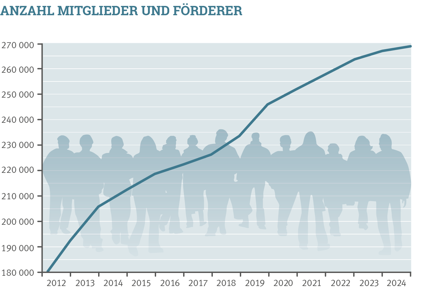 Zum 31. Dezember 2024 hatte der BUND Naturschutz fast 269.000 Mitglieder und Förderer. Ein neuer Höchststand - und das in Krisenzeiten, in denen zu befürchten war, dass die Menschen andere Prioritäten setzen. Die mittlerweile deutlich spürbare Klimakrise und die ökonomischen Folgen des Angriffskriegs auf die Ukraine sind nur einige Hürden, die als Gesellschaft zu bewältigen sind. Trotz vieler Versuche mancher Politikkreise, Natur-, Umwelt- und Klimaschutz als nachrangig einzustufen, erkennt ein Großteil der Bevölkerung die Relevanz von Umwelt- und Naturschutz und ist offen und großzügig. Über die Internetseite des BN sowie über die zahlreichen Aktionen und Aktivitäten des Landesverbands und der Kreisgruppen konnte der BN wieder viele neue Mitglieder willkommen heißen. Gute Dienste bei der Information von Interessenten leistete das Faltblatt “Erfolge”. Beliebtester Zugang war mit Abstand das Beitrittsformular auf der BN-Webseite. Die BUND Naturschutz Marketing GmbH gewann rund 5300 neue Mitglieder. Über unseren langjährigen Partner HSP kamen rund 5500 Menschen als Mitglieder und Förderer zum BN.