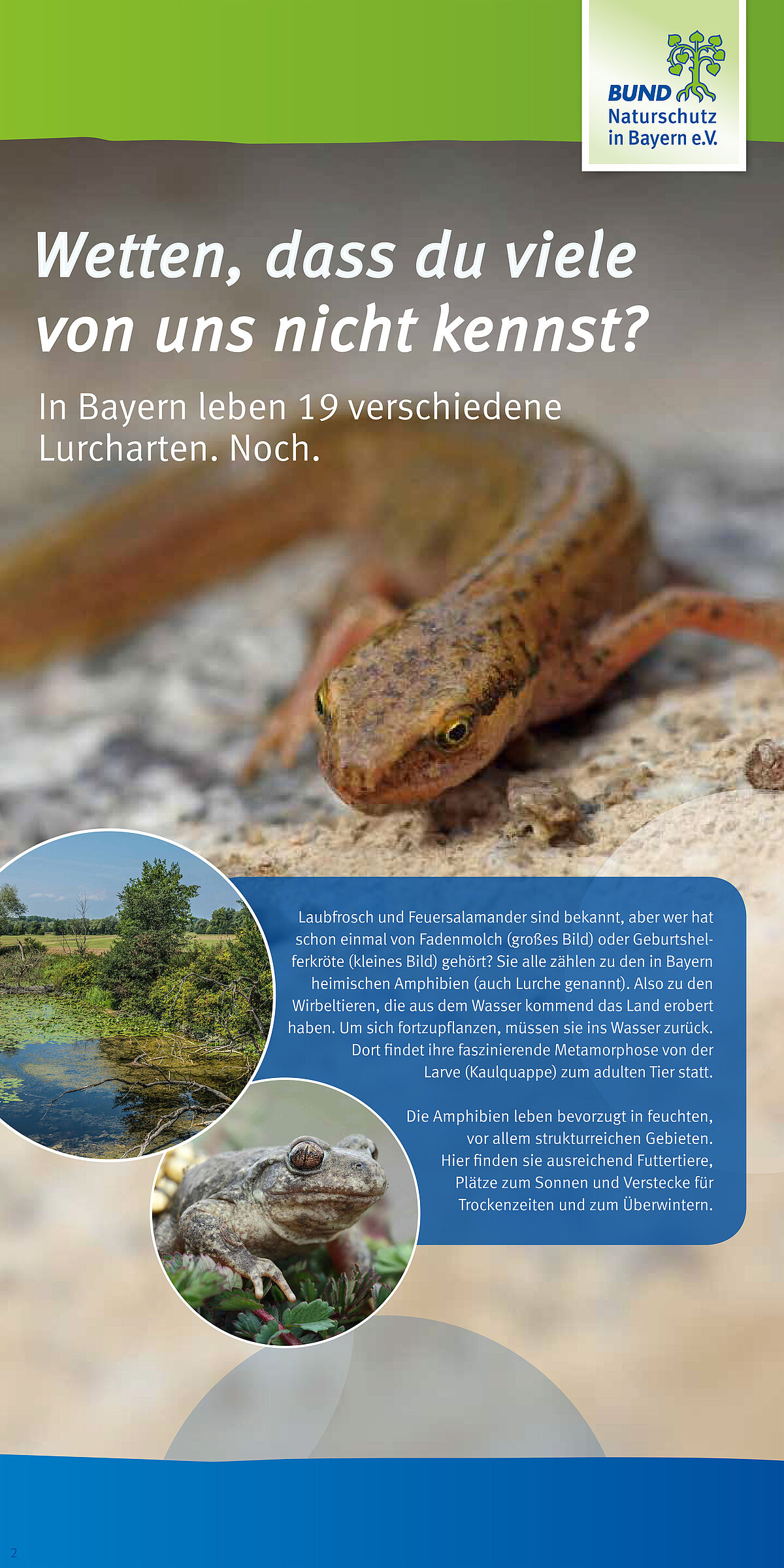 Laubfrosch und Feuersalamander sind bekannt, aber wer hat schon einmal von Fadenmolch oder Geburtshelferkröte gehört? Sie alle zählen zu den in Bayern heimischen Amphibien (auch Lurche genannt). Also zu den Wirbeltieren, die aus dem Wasser kommend das Land erobert haben.